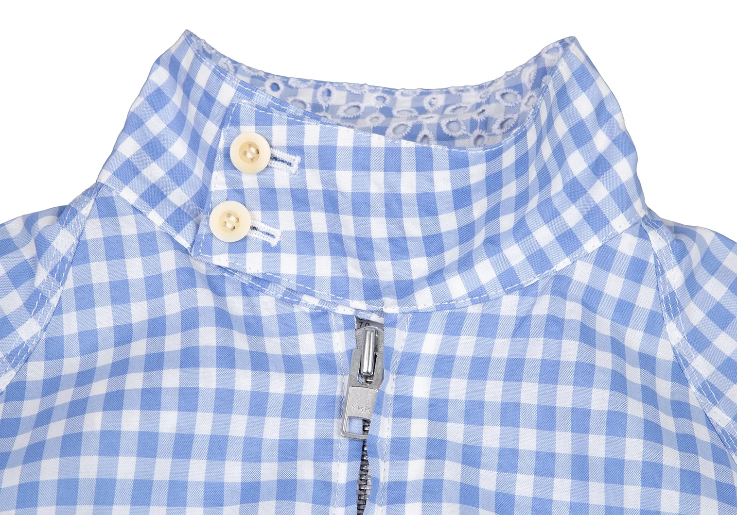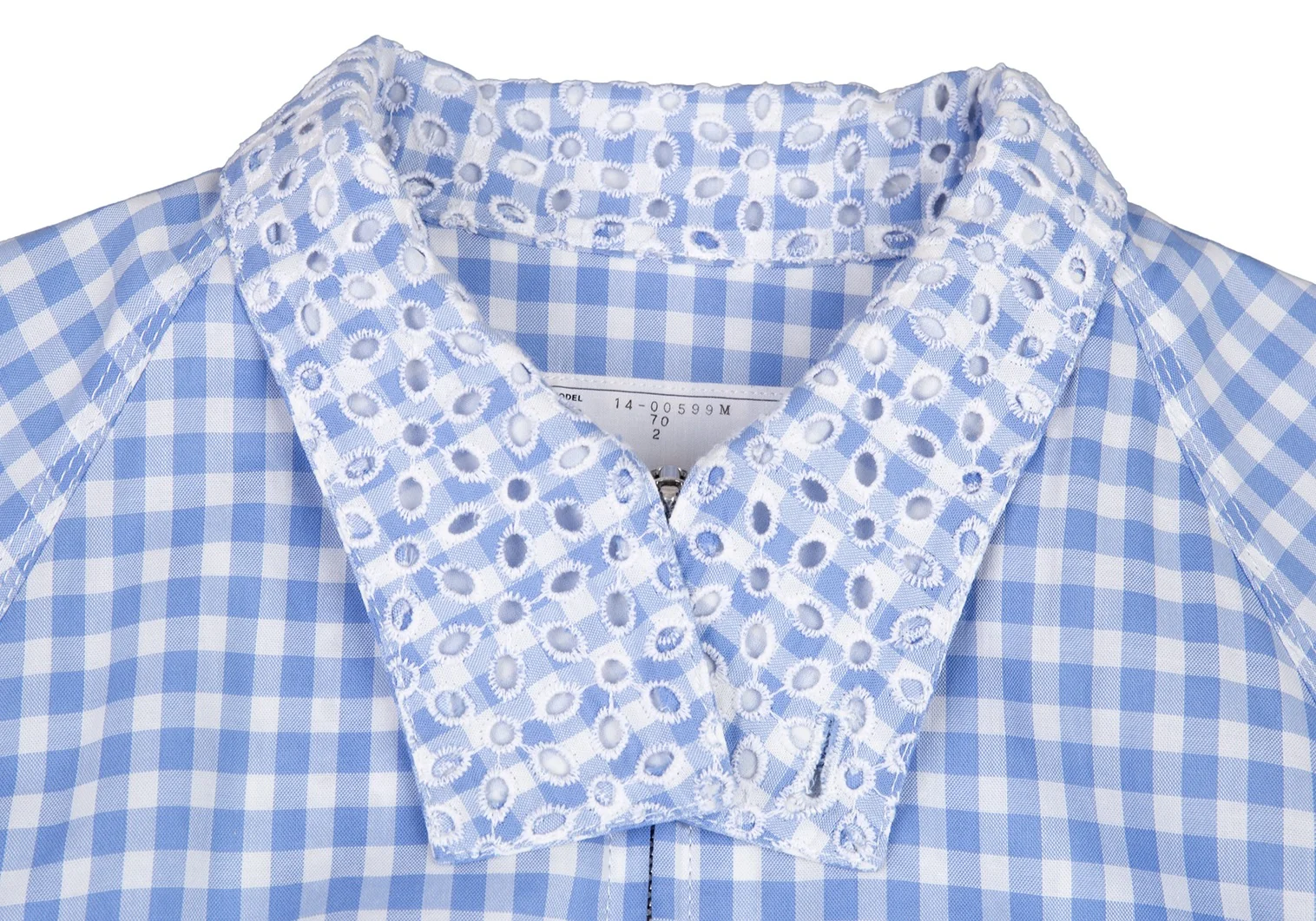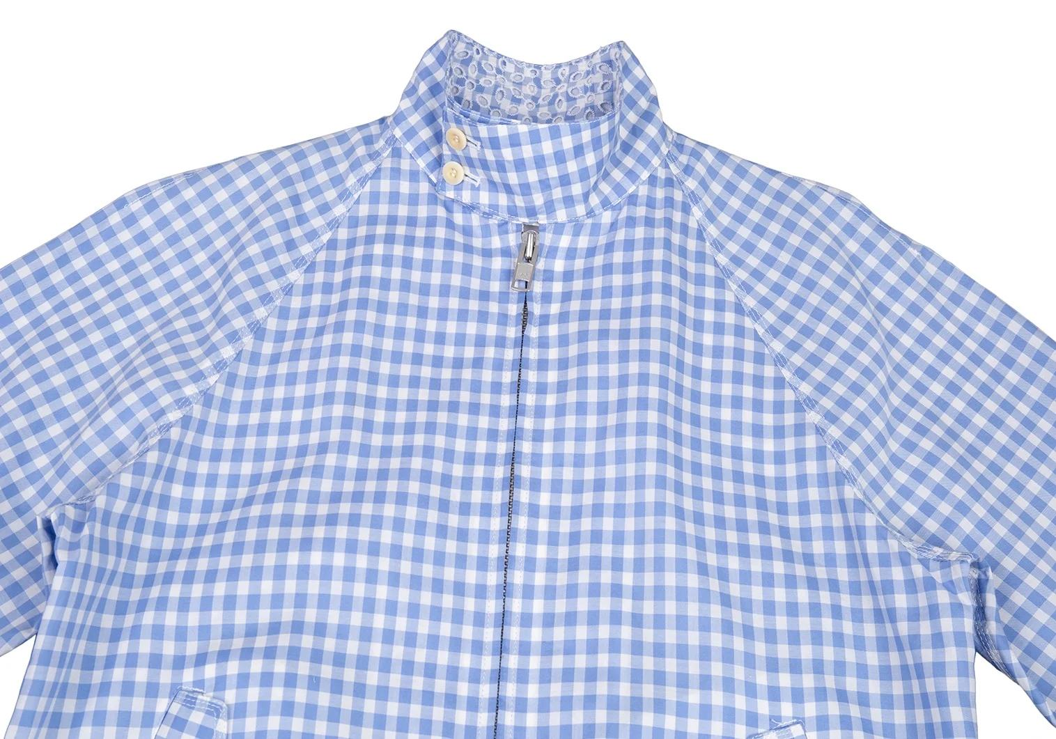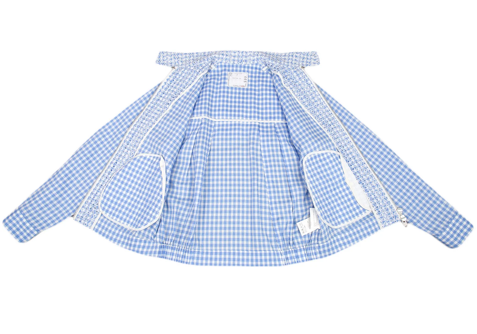 サカイSacai 襟エンブロイダリーレースギンガムチェックスイングトップジャケット 白水色2