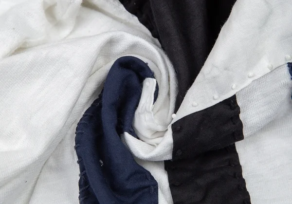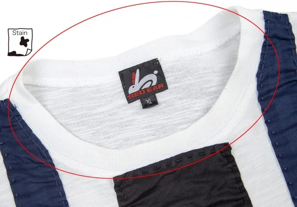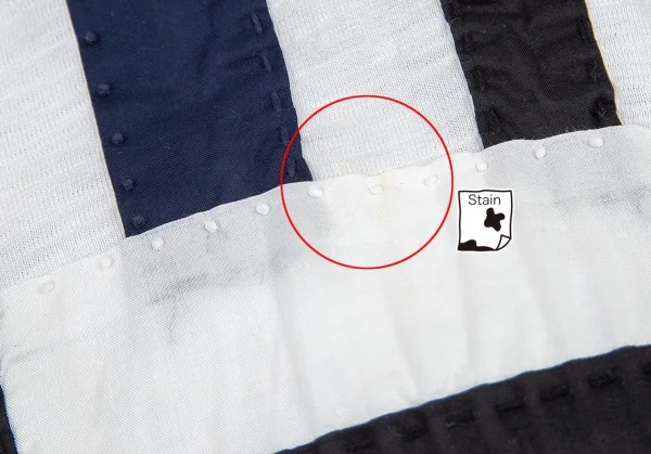 ハンドステッチが施されています。襟ぐりに薄汚れ、前身頃・背中にシミがあります(画像参照)。その他目立ったシミ、汚れ、ほつれ等ありません。クリーニング済み