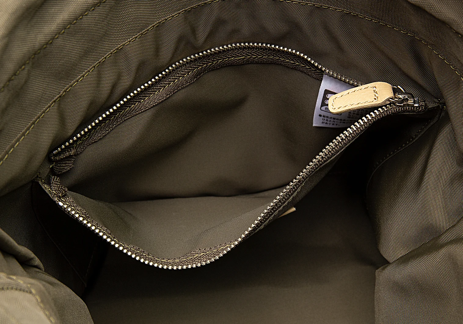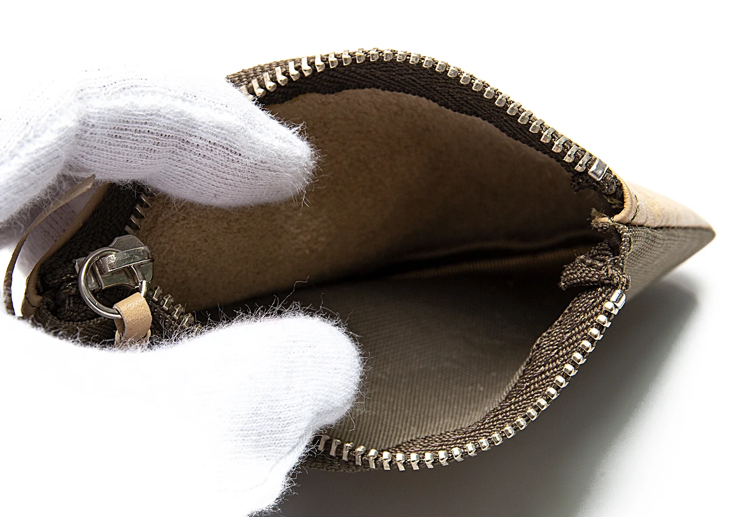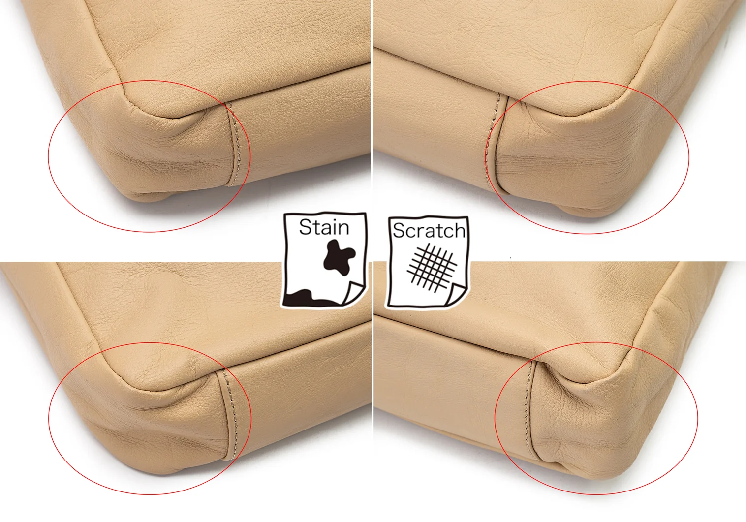 ポーチが付属します。外側ジップポケット1つ、内側ジップポケット1つ、オープンポケット2つあります。表面に点汚れ、角にスレと薄汚れがあります(画像参照)。その他目立った傷や汚れなどなくいい状態です。