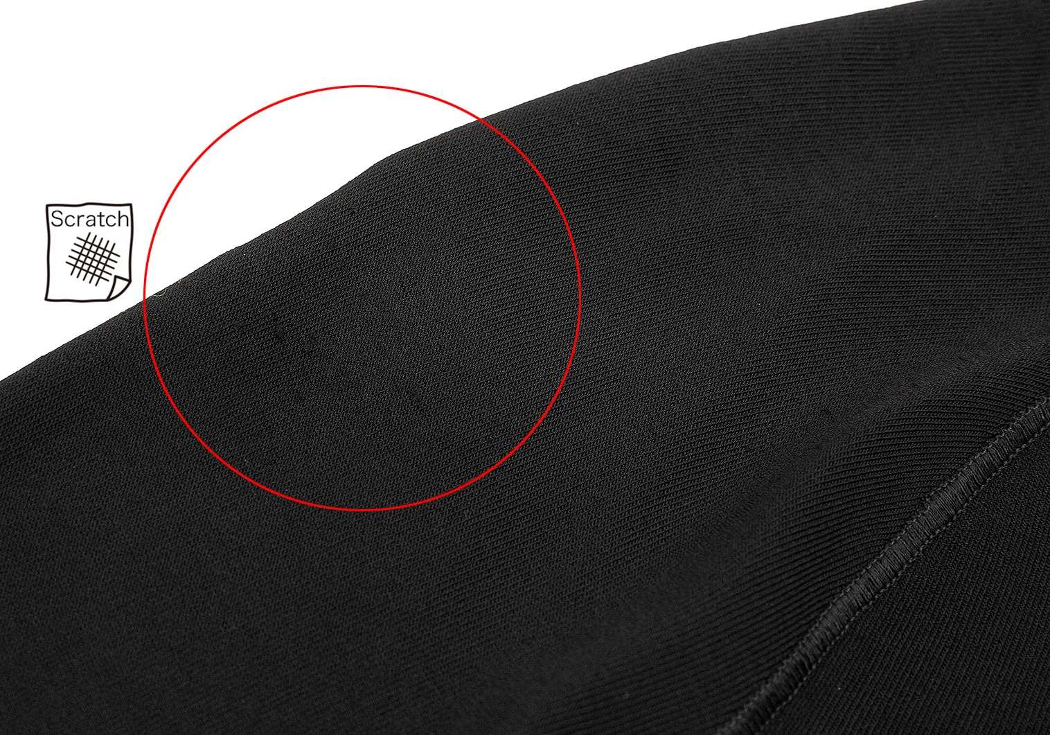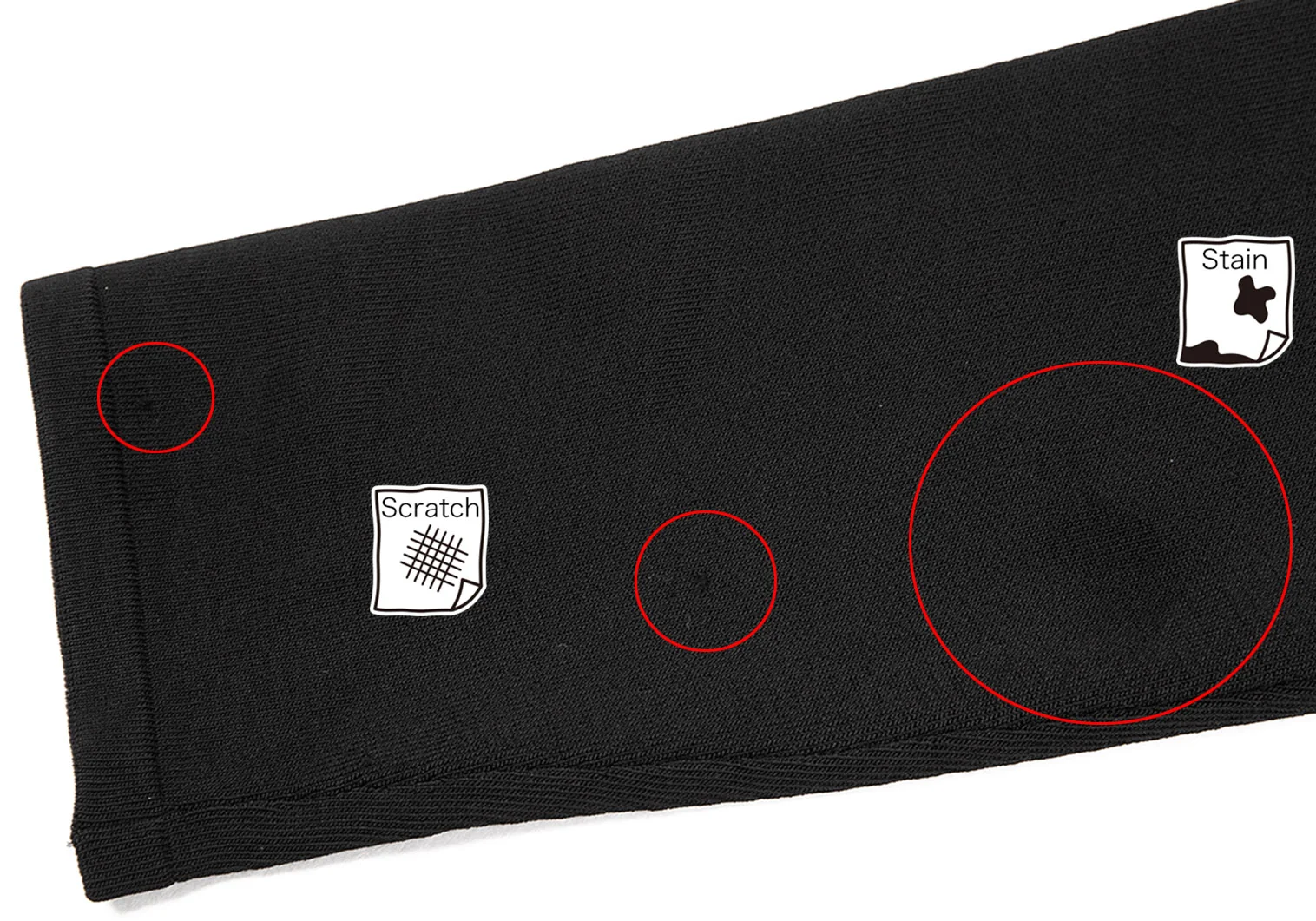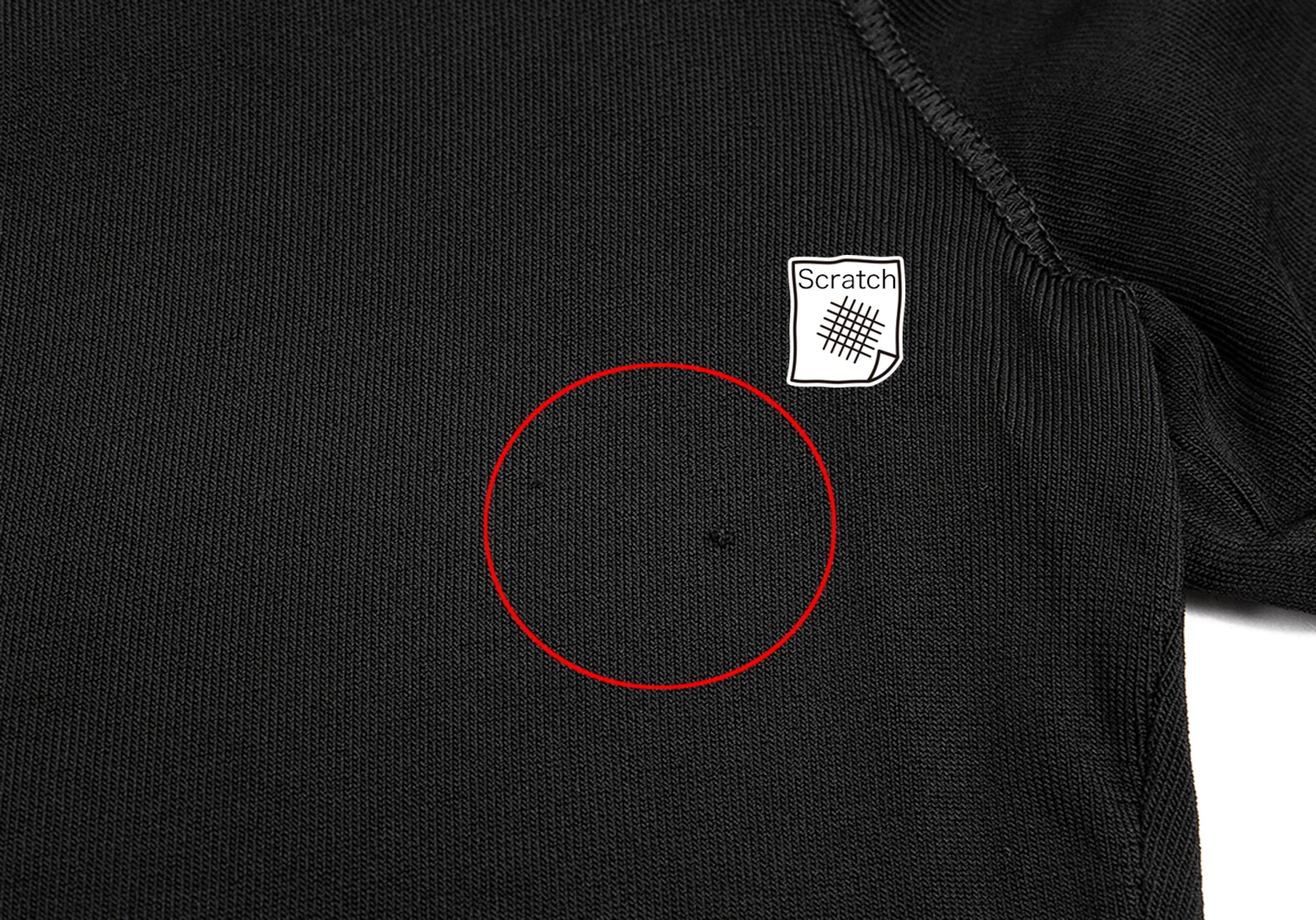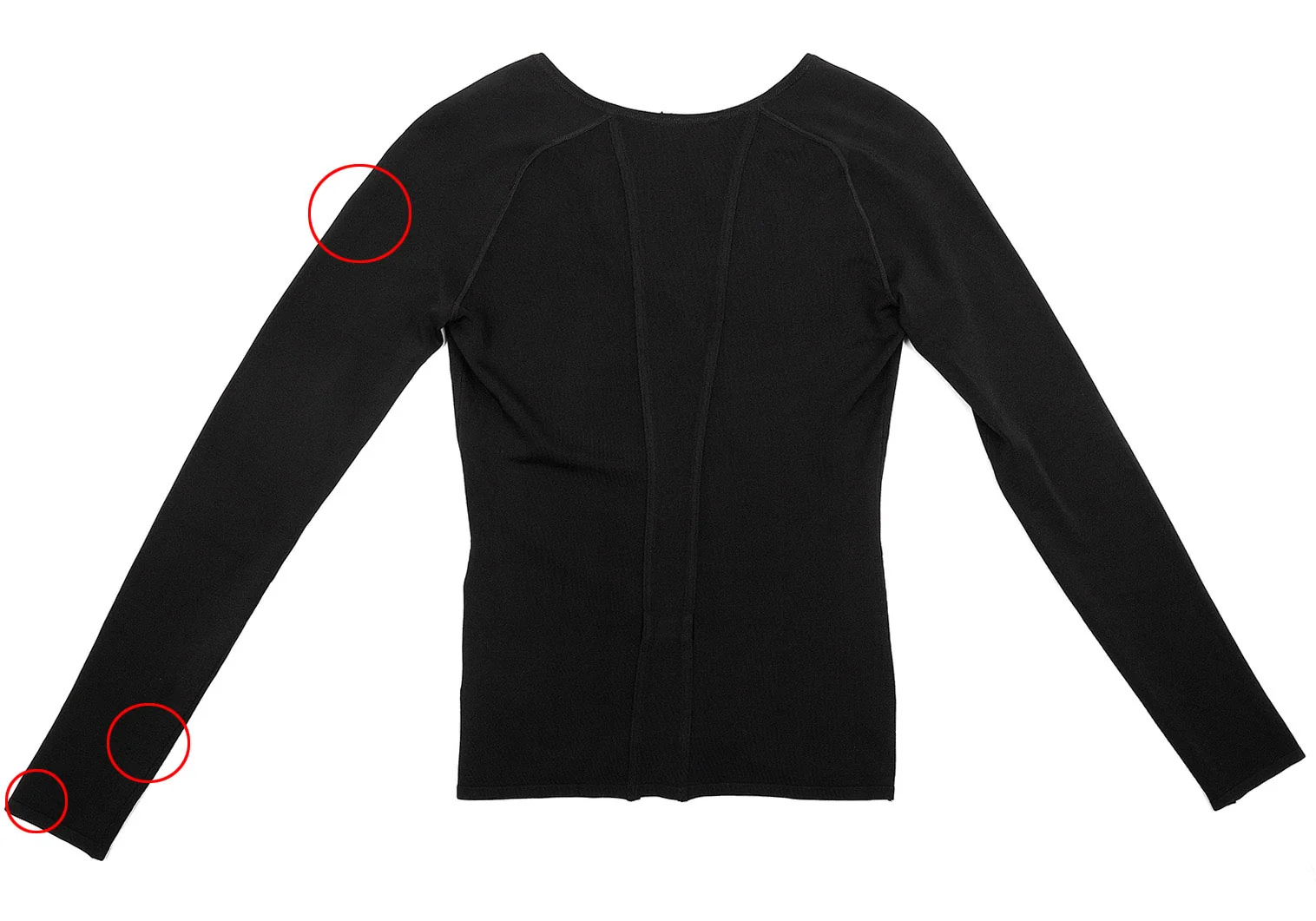 胸元・後左袖に引っ掛け、後左袖にシミがあります(画像参照)。その他目立ったシミ、汚れ、ほつれ等ありません。クリーニング済み