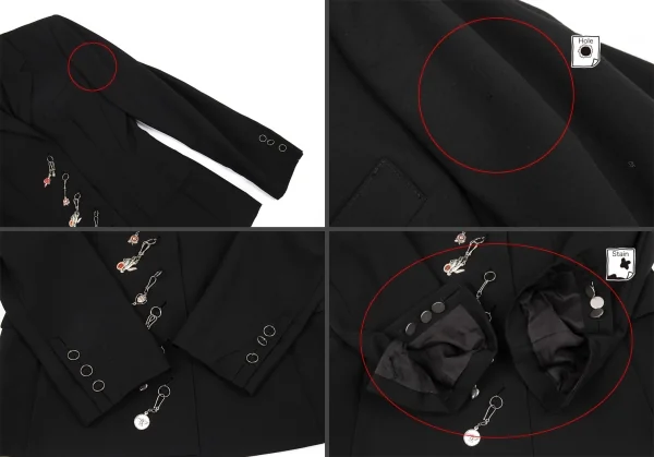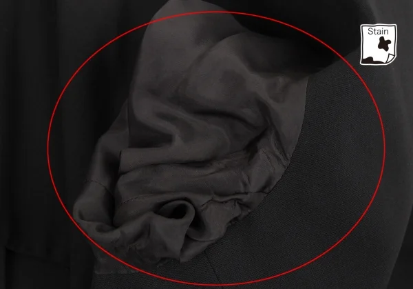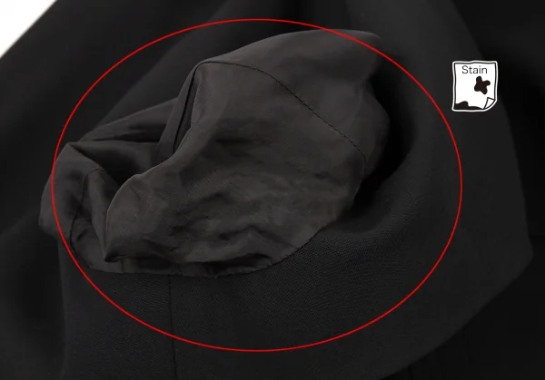 肩パッドあり。左袖に小穴、袖裏・裏地脇下にシミがあります(写真参照)。その他に目立ったシミ、汚れ、ほつれ等はありません。クリーニング済み