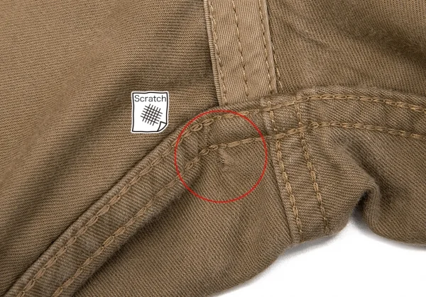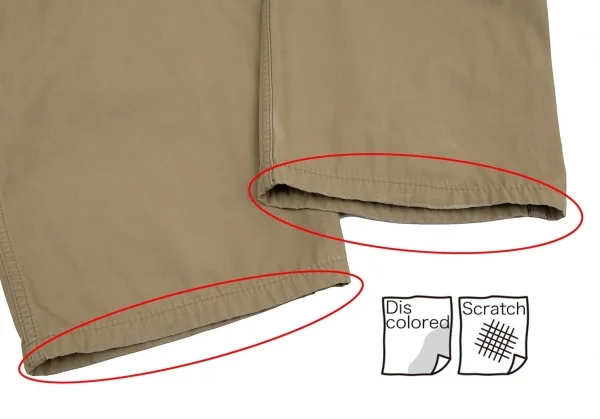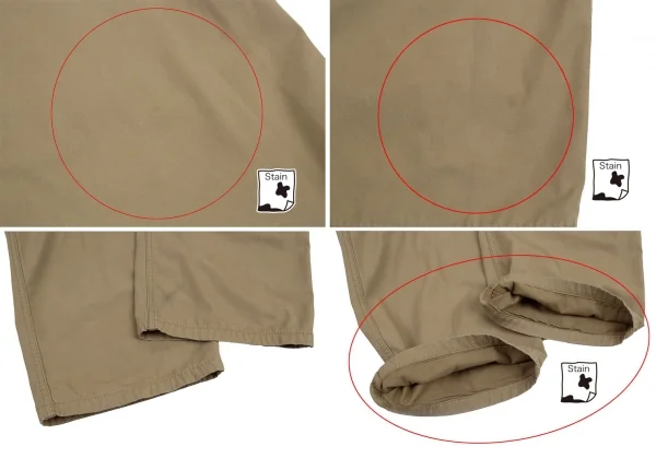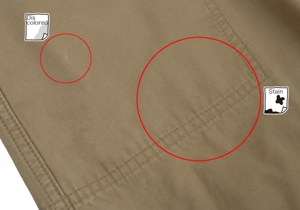 前面にシミ数カ所、前後に汚れ・スレ・色褪せがあります。裏側は全体的に毛羽立ち、股下にダメージがあります。(画像参照)。その他目立ったシミ、汚れ、ほつれ等ありません。クリーニング済み