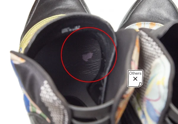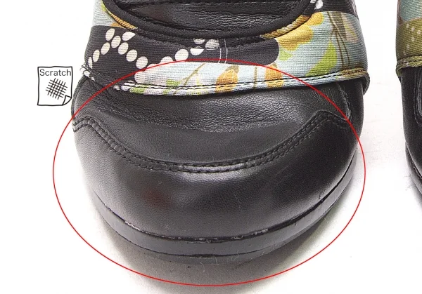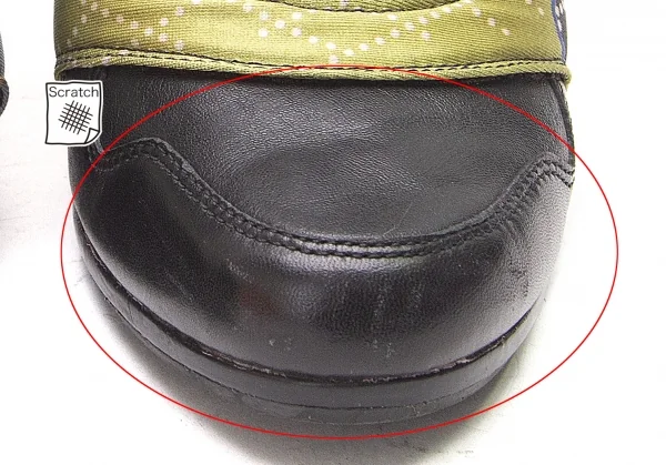 つま先にスレ・キズ、踵ラバー部分にベタつき、内側ソールに剥がれがあります(画像参照)。全体的に少し使用感がありますが、ご着用に問題はありません。