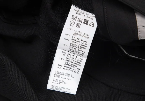 毛100% 別布 毛100% 裏地 キュプラ100% 袖裏 キュプラ100% 装飾部分 毛88% ナイロン10% その他2% スパンコール ポリエステル100% 刺繍糸 レーヨン50% ポリエステル50%