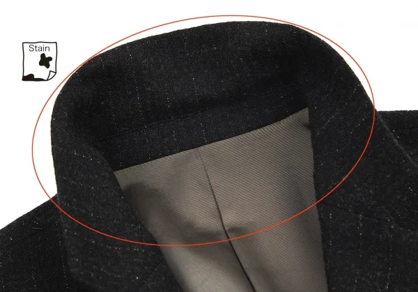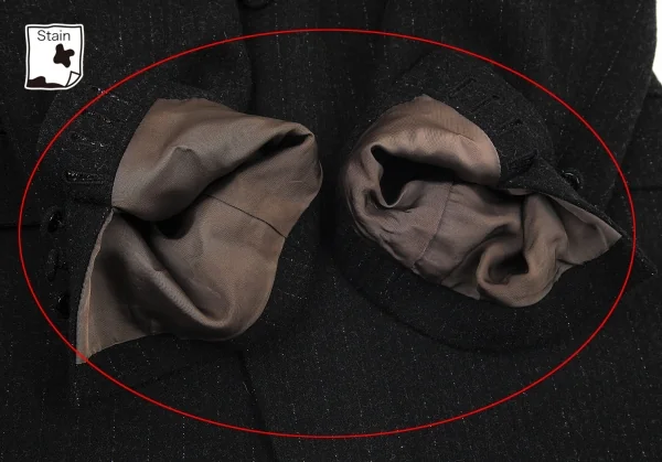 ジャケットの首元、袖裏に汚れ、パンツの股裏生地スレがあります(写真参照)。その他に目立ったシミ、汚れ、ほつれ等はありません。クリーニング済み