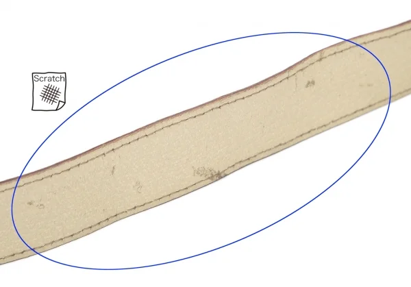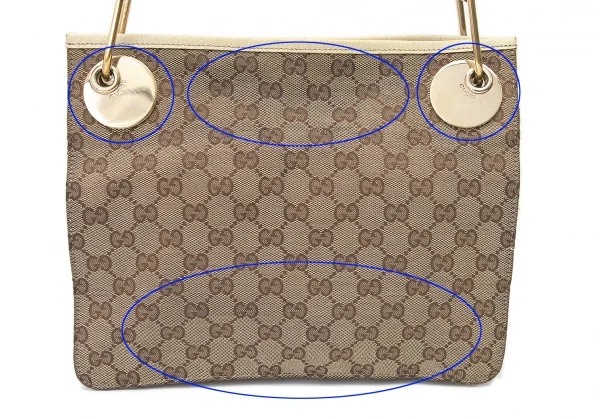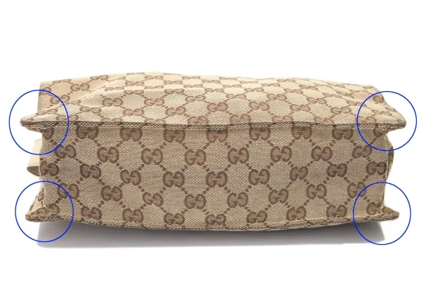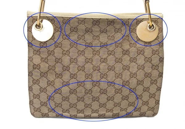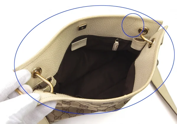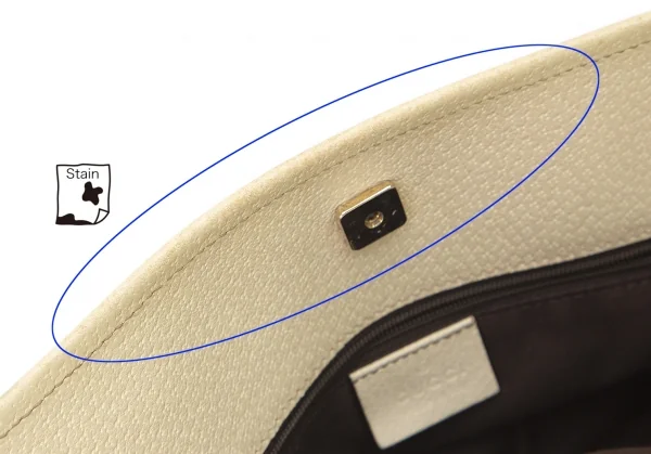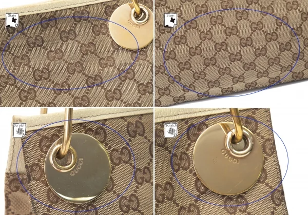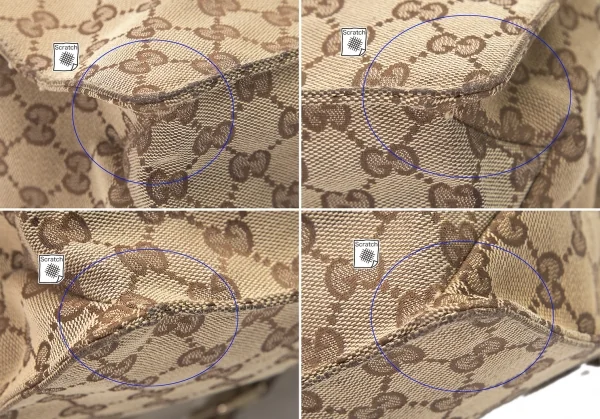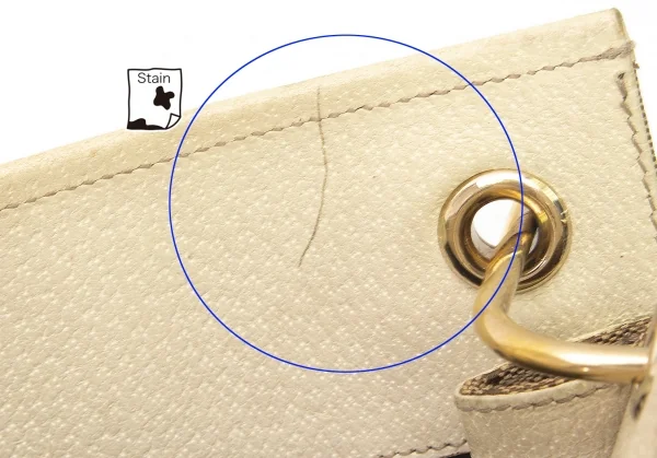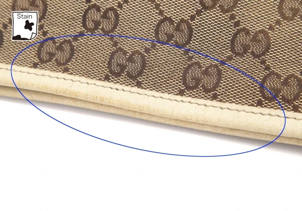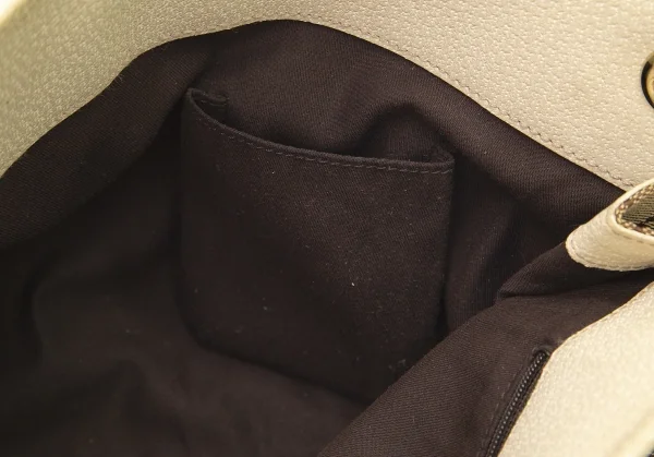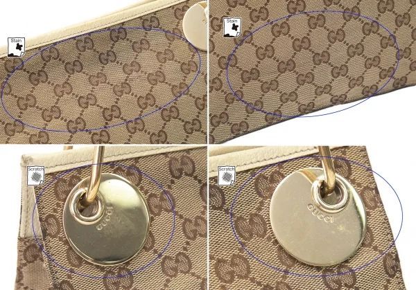 内側ジップポケット1つ、小ポケット1つ。キャンバス部分・開口部レザーに薄汚れ、金具・ベルトにキズ、角スレ、裏側にペン跡があります(写真参照)。全体的に使用感がありますが、まだまだご使用いただけるお品です。
