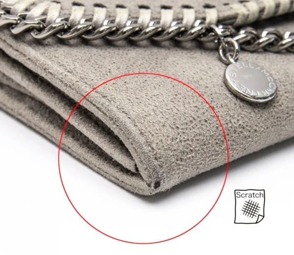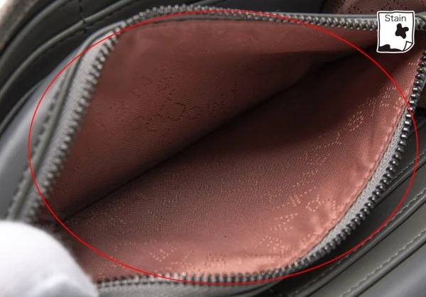 角擦れ、前面レースアップ部分・コインポケット内に薄汚れ、内側に変色・角に生地割れがあります。その他に目立ったシミ、汚れ等はありません。