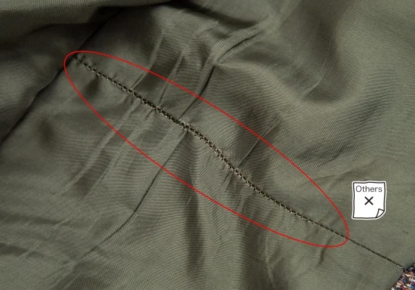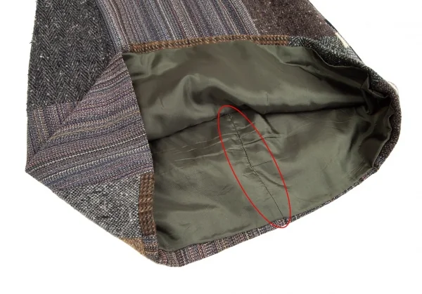 品質表示タグがありません。ヒップ裏地に縫い目の広がりがあります(画像参照)。その他目立ったシミ、汚れ、ほつれ等なくいい状態です。クリーニング済み