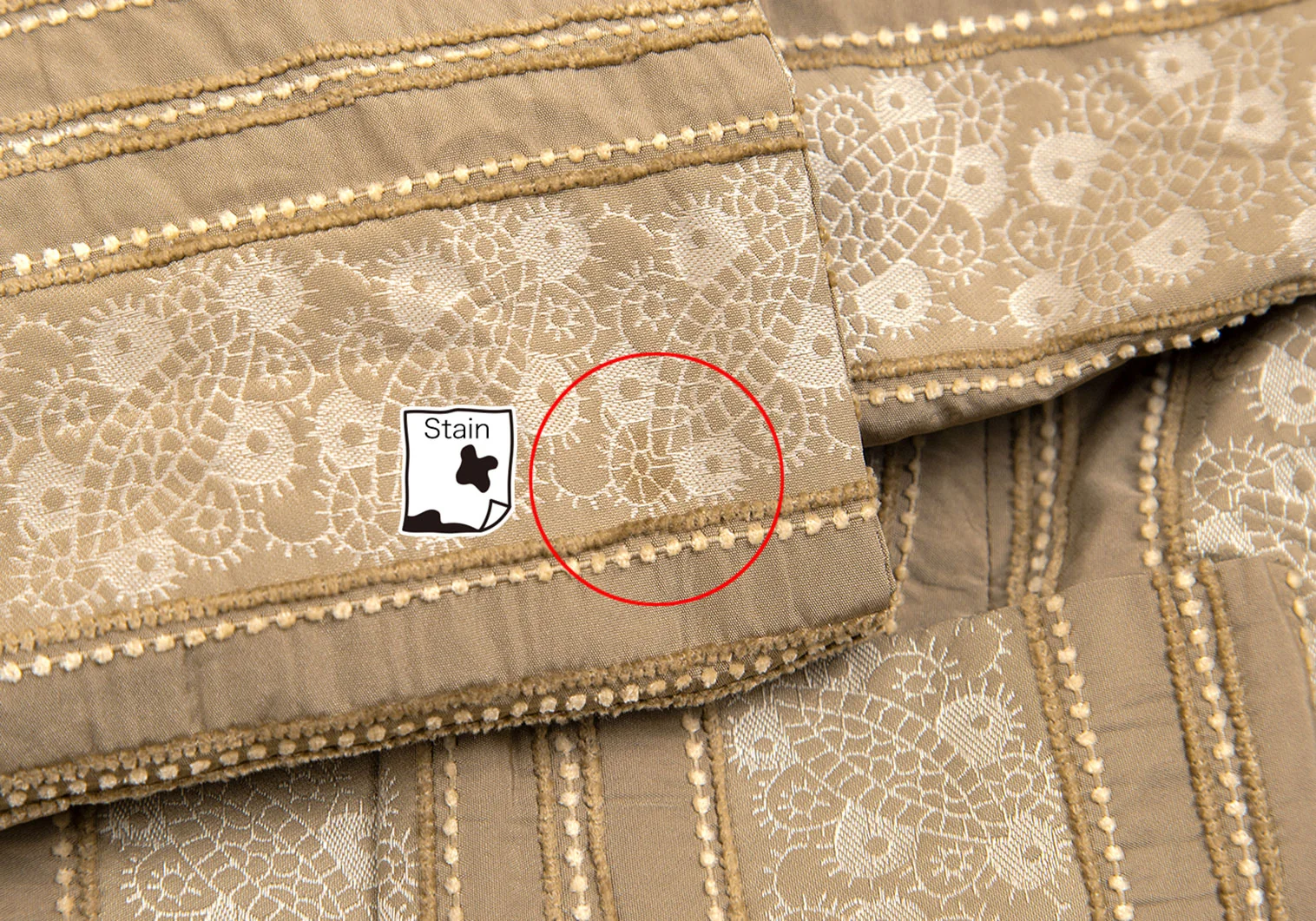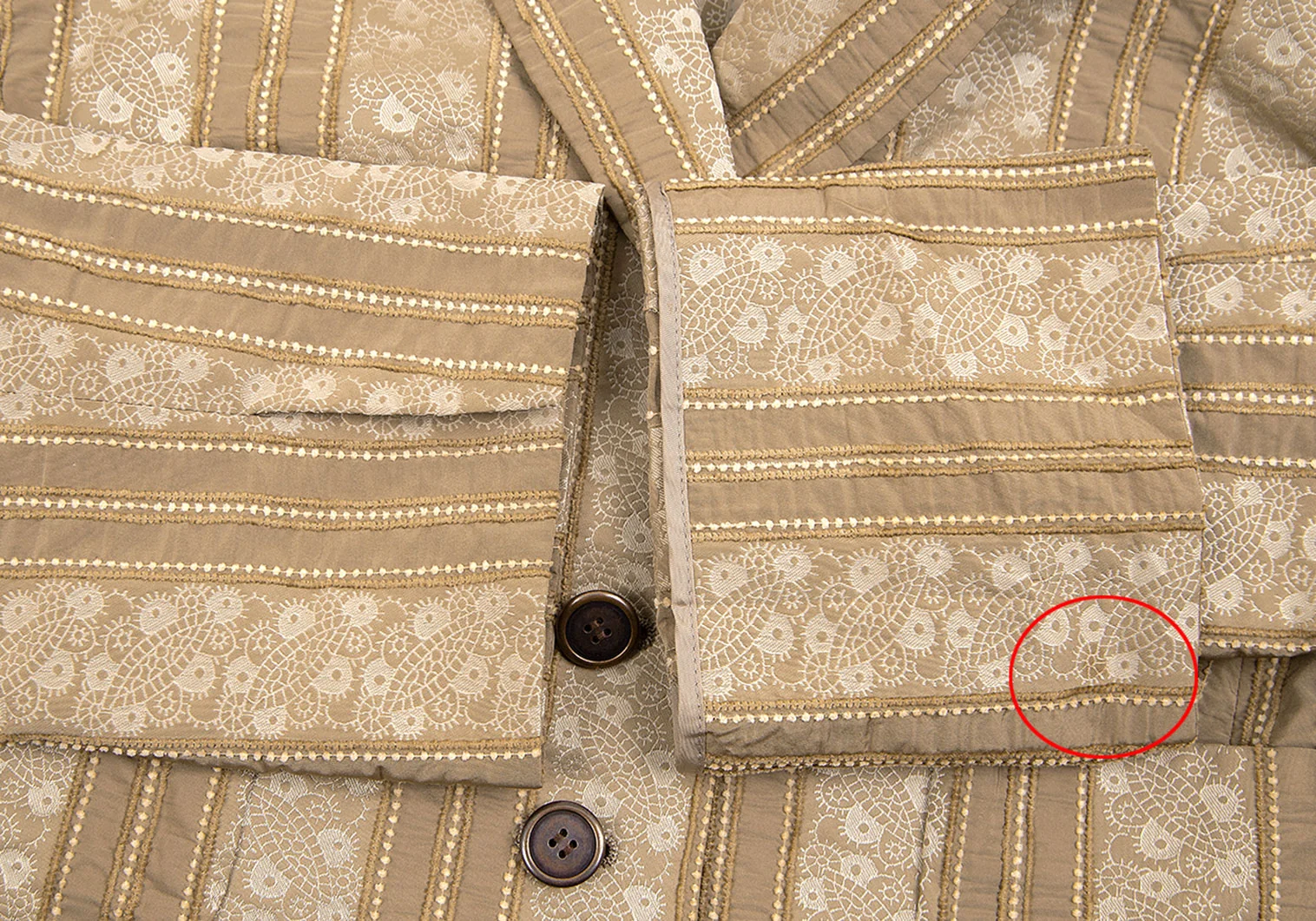 薄手の肩パットあり。左袖裏に薄シミがあります(画像参照)。その他目立ったシミ、汚れ、ほつれ等ありません。クリーニング済み
