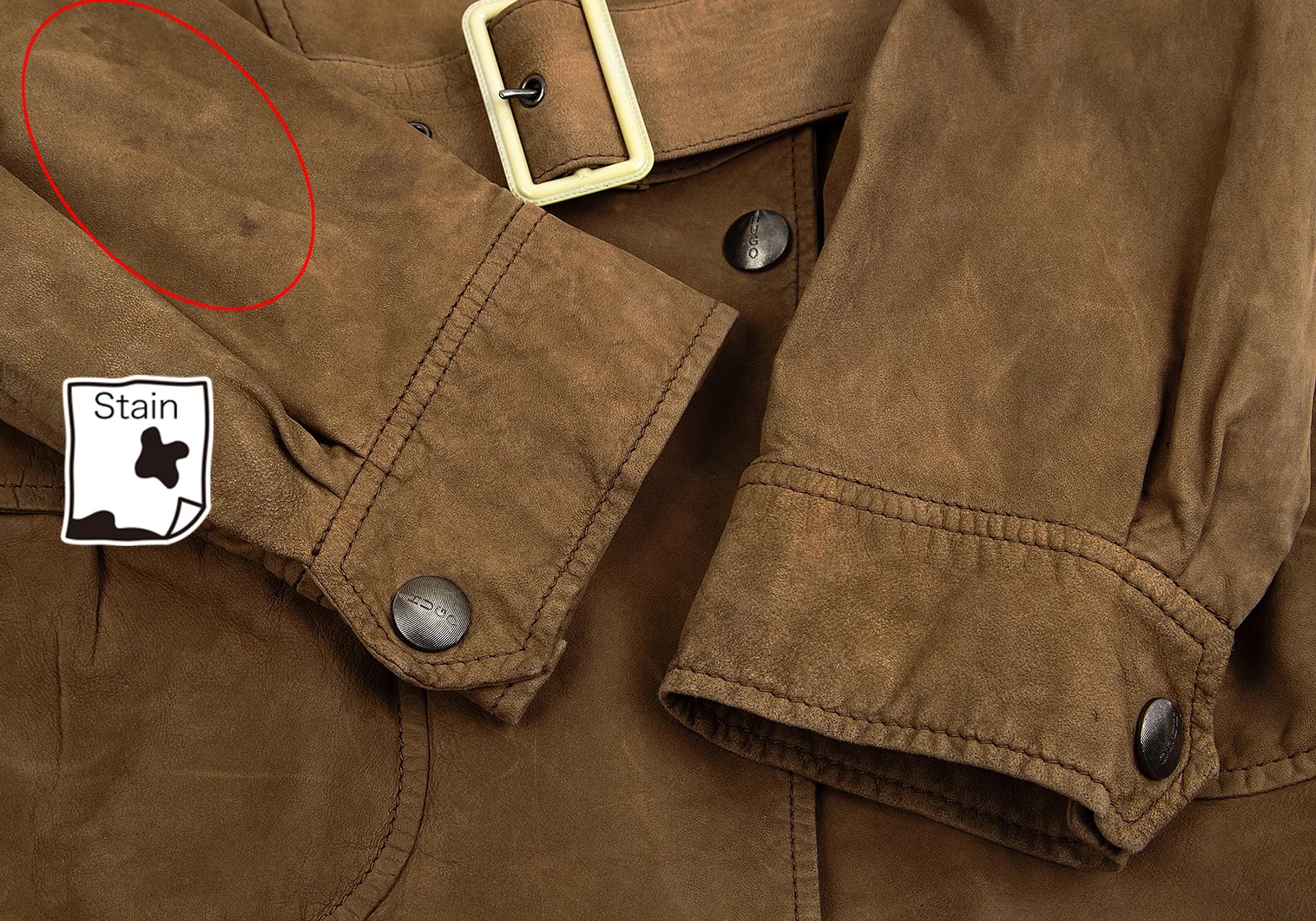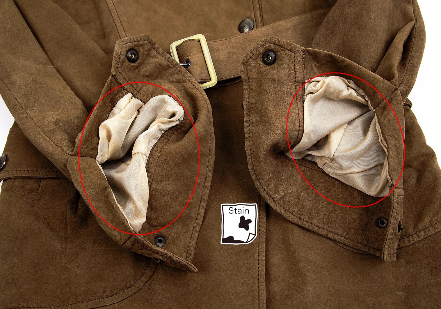 右袖にシミ、袖裏に薄汚れがあります。(写真参照)その他レザー特有のスレ感等はありますが目立ったシミ、汚れ、ほつれ等なくいい状態です。クリーニング済み