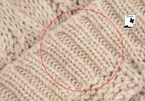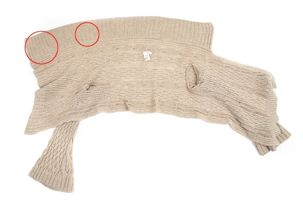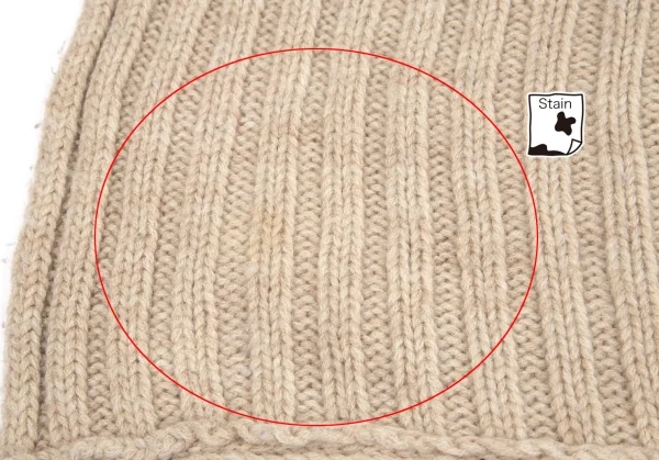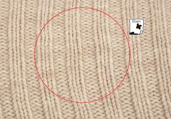 編み目から内側が透けます。袖裏・前立て裏に薄シミがあります(写真参照)。その他に目立ったシミ、汚れ、ほつれ等ありません。クリーニング済み