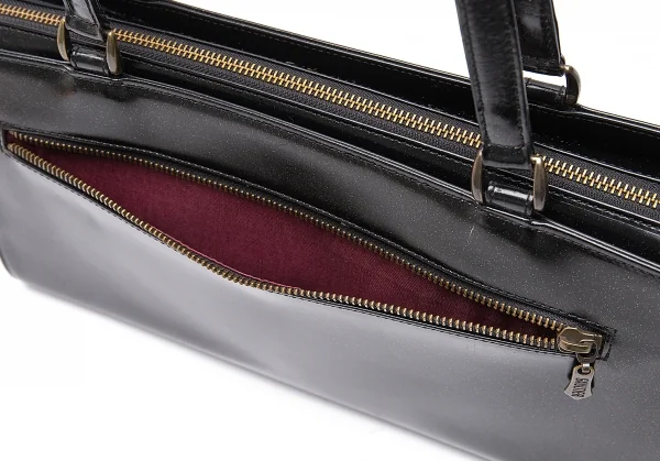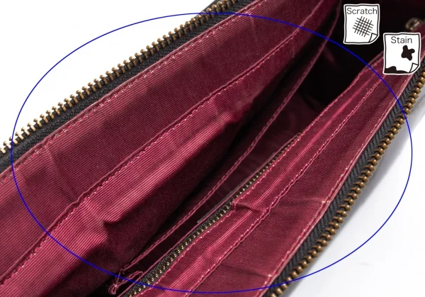 内側にオープンポケット×2、ジップポケット×1があります。全体に小キズ、背面・ハンドル金具周りにキズ、底角に擦れ、開き口・に薄汚れ・擦れがあります(写真参照)。その他に目立った汚れはありません。