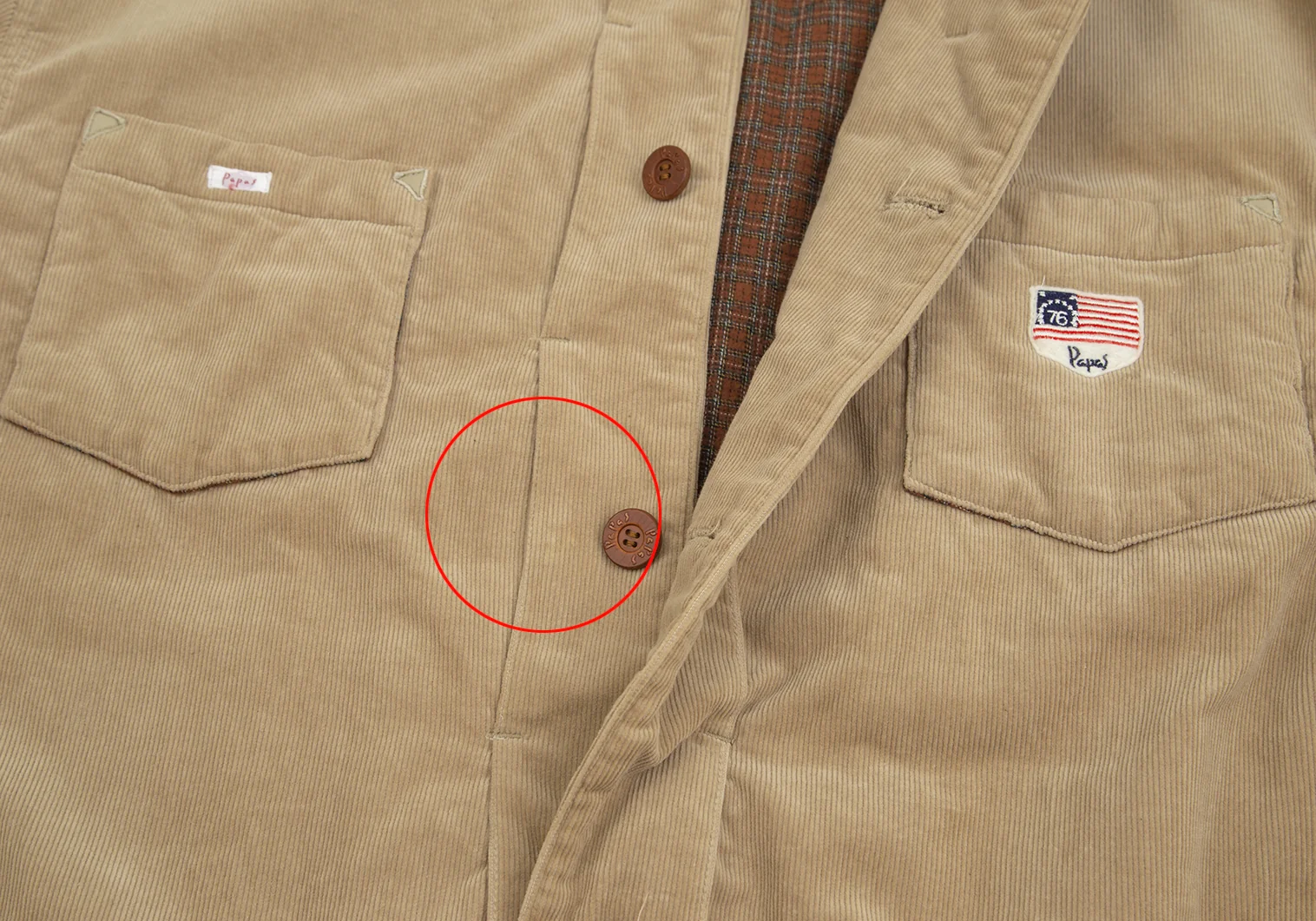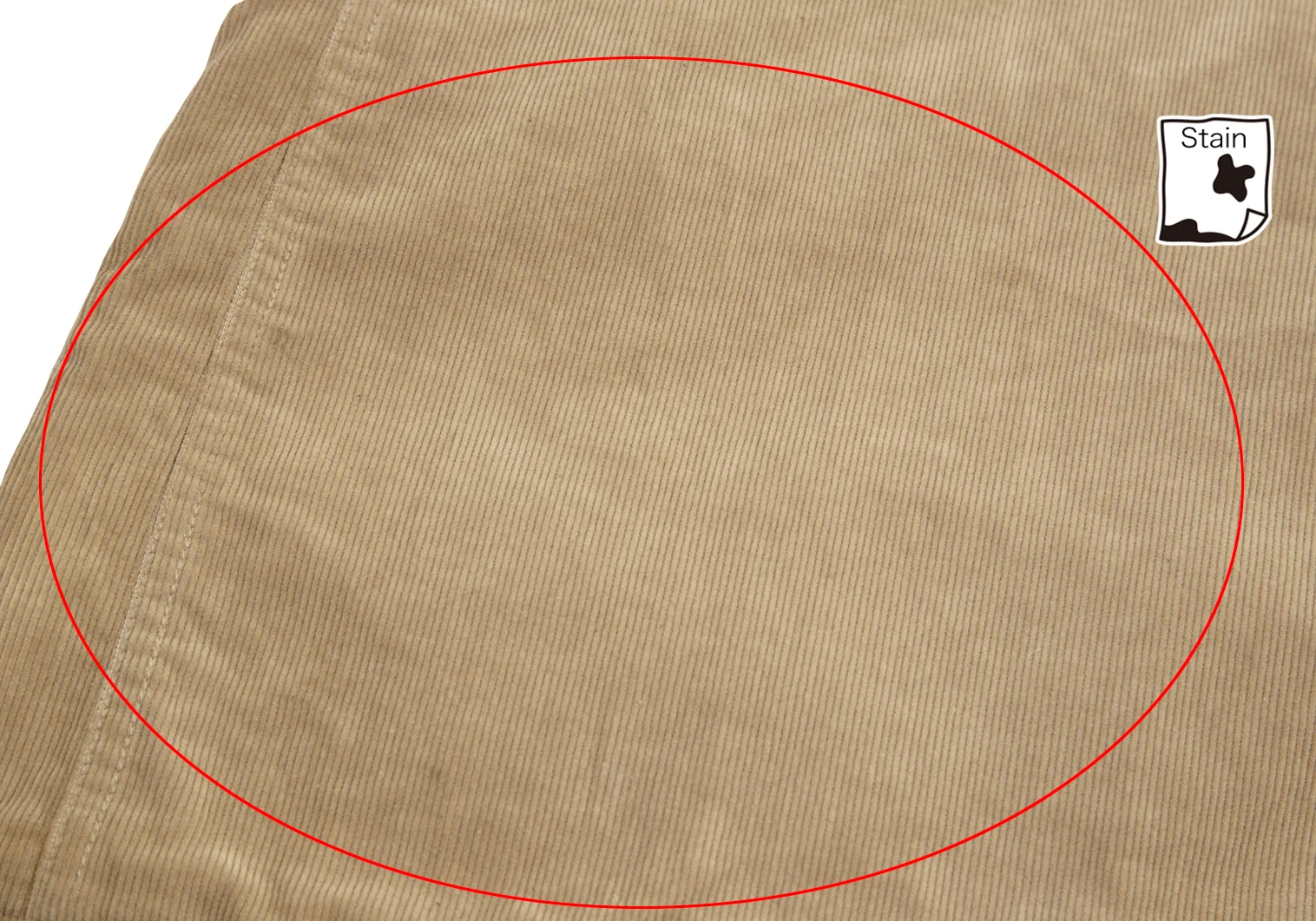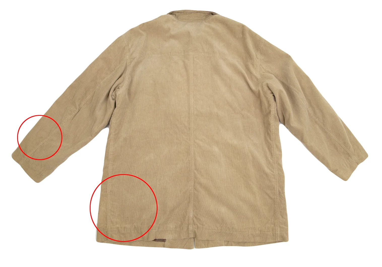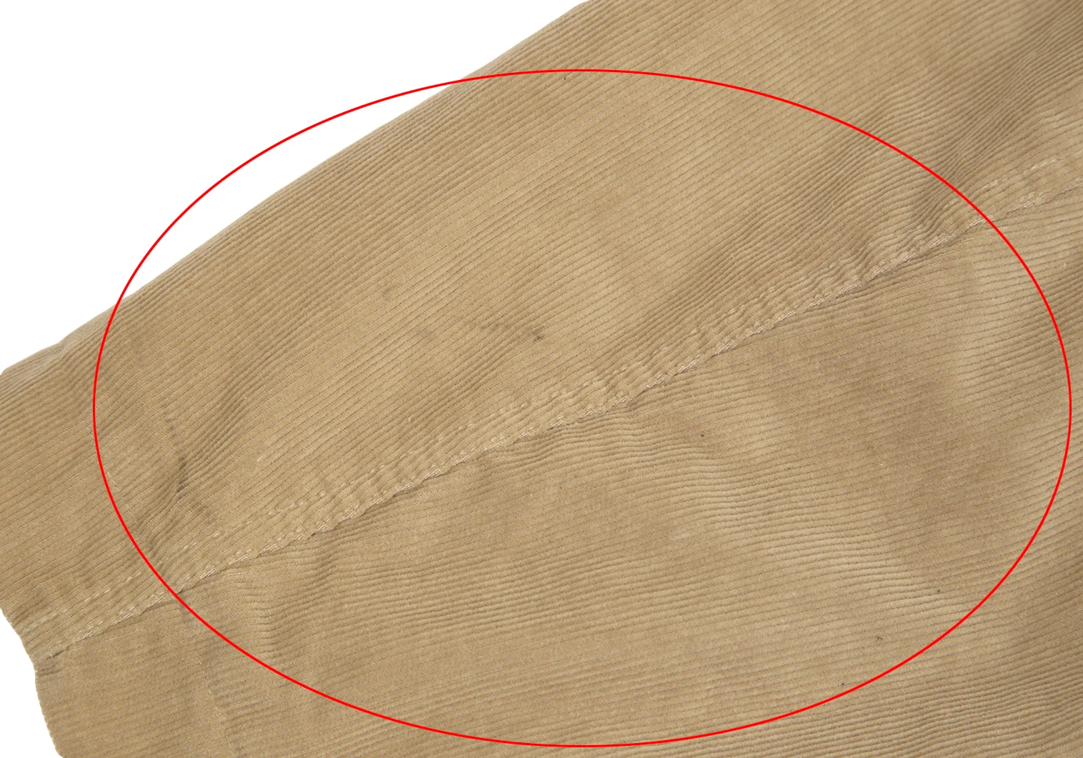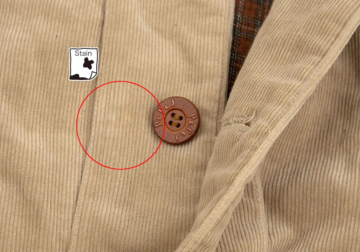 前立てに薄シミ、左袖先・後ろ裾に薄汚れがあります(写真参照)。その他に目立ったシミ、汚れ、ほつれ等なくいい状態です。クリーニング済み