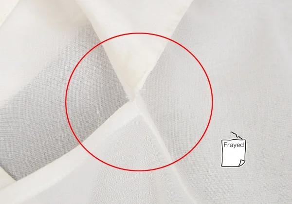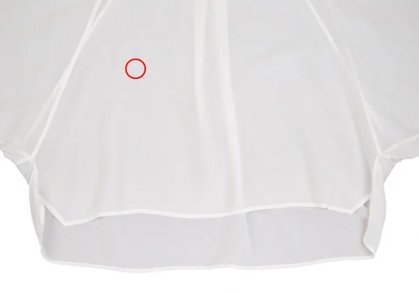 透け感のある生地です。首元一部に生地の裂け、首裏に薄汚れ、前身頃に点シミがあります(画像参照)。その他目立ったシミ、汚れ、ほつれ等ありません。クリーニング済み