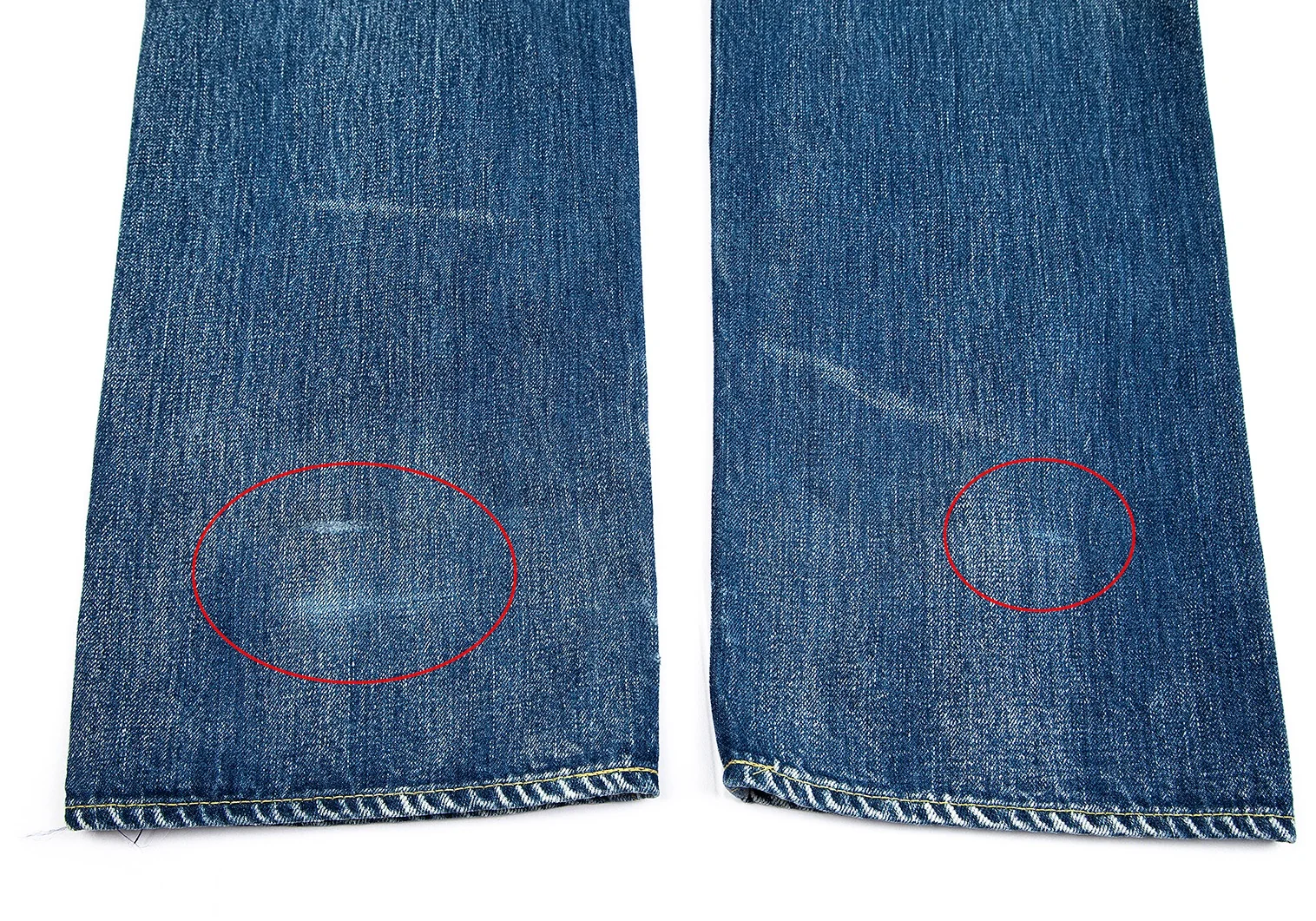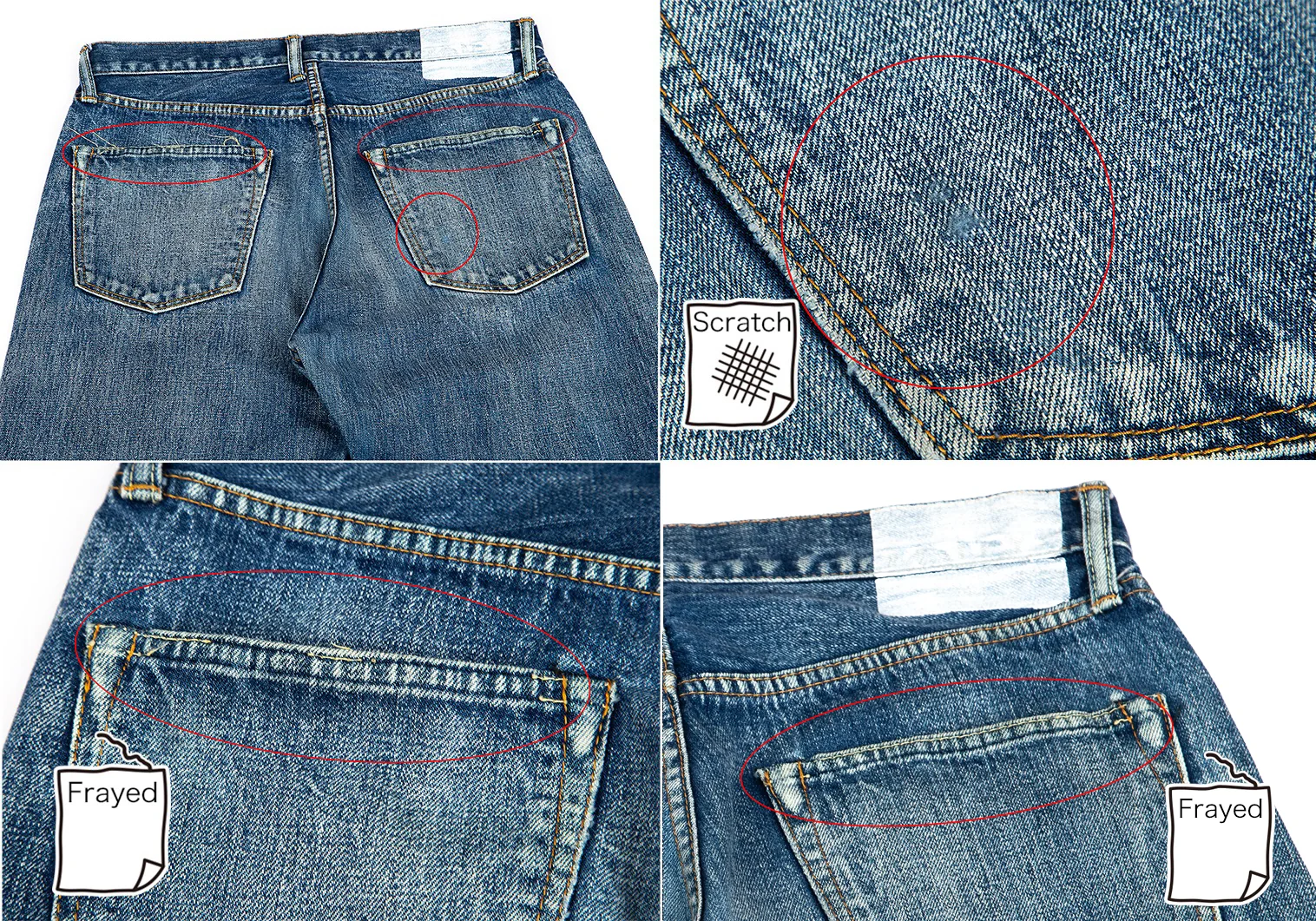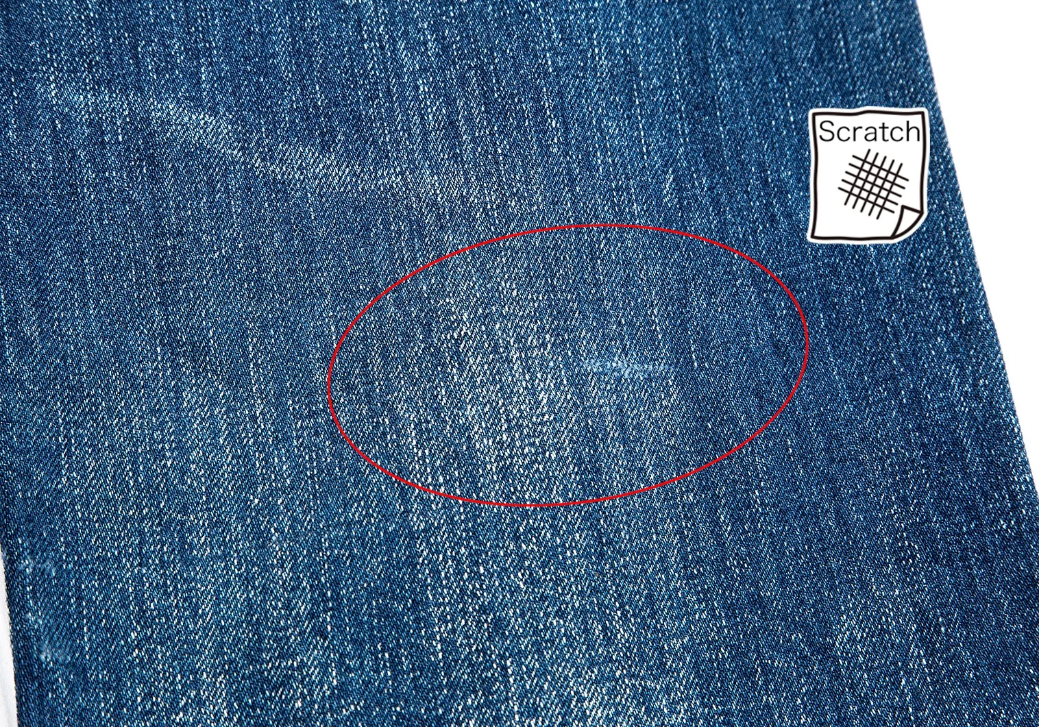 股下にスレ、点シミ、後ろポケットステッチ切れ・スレ、裾表裏に折り跡があります。(写真参照)その他目立ったシミ、汚れ、ほつれ等ありません。クリーニング済み