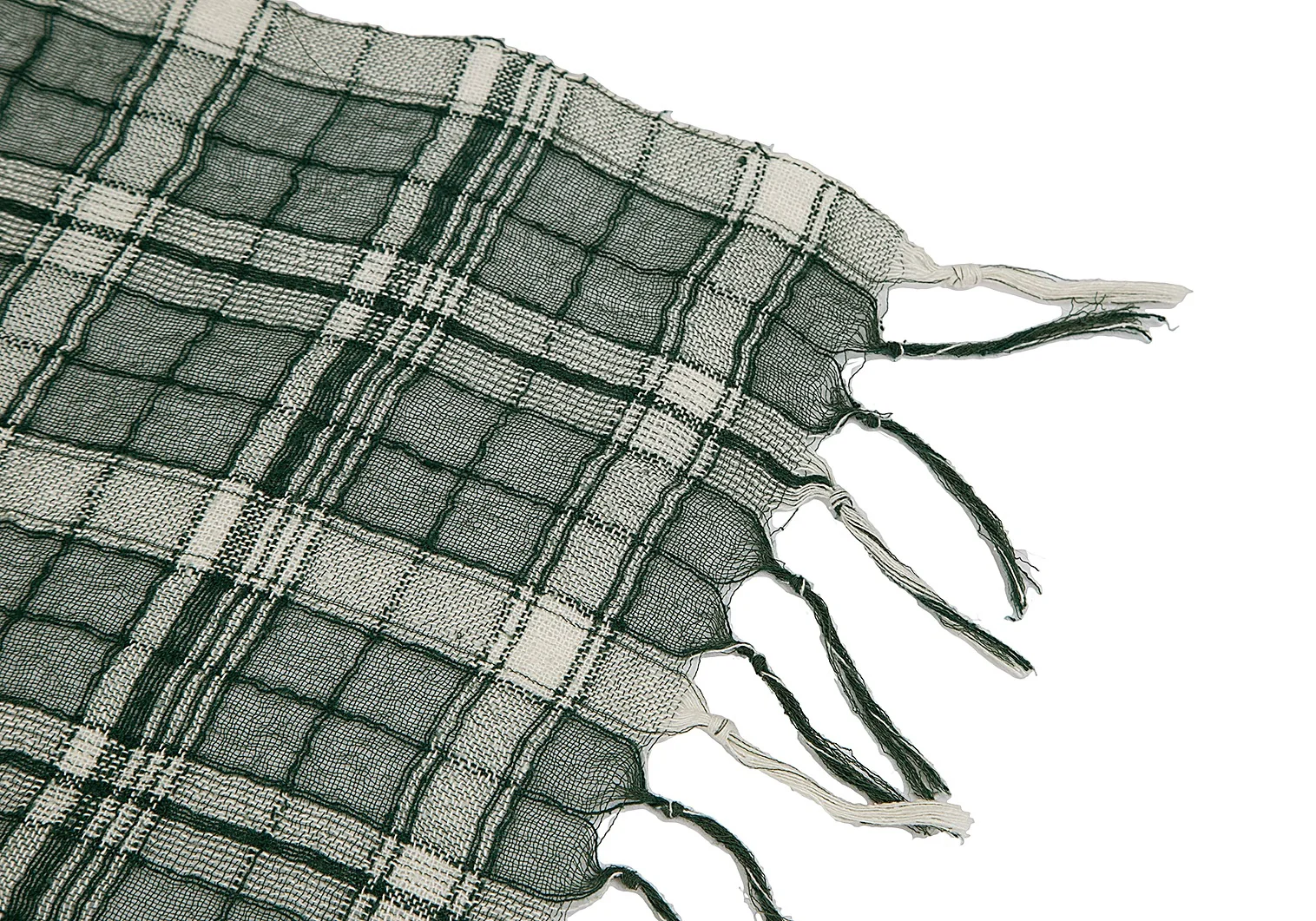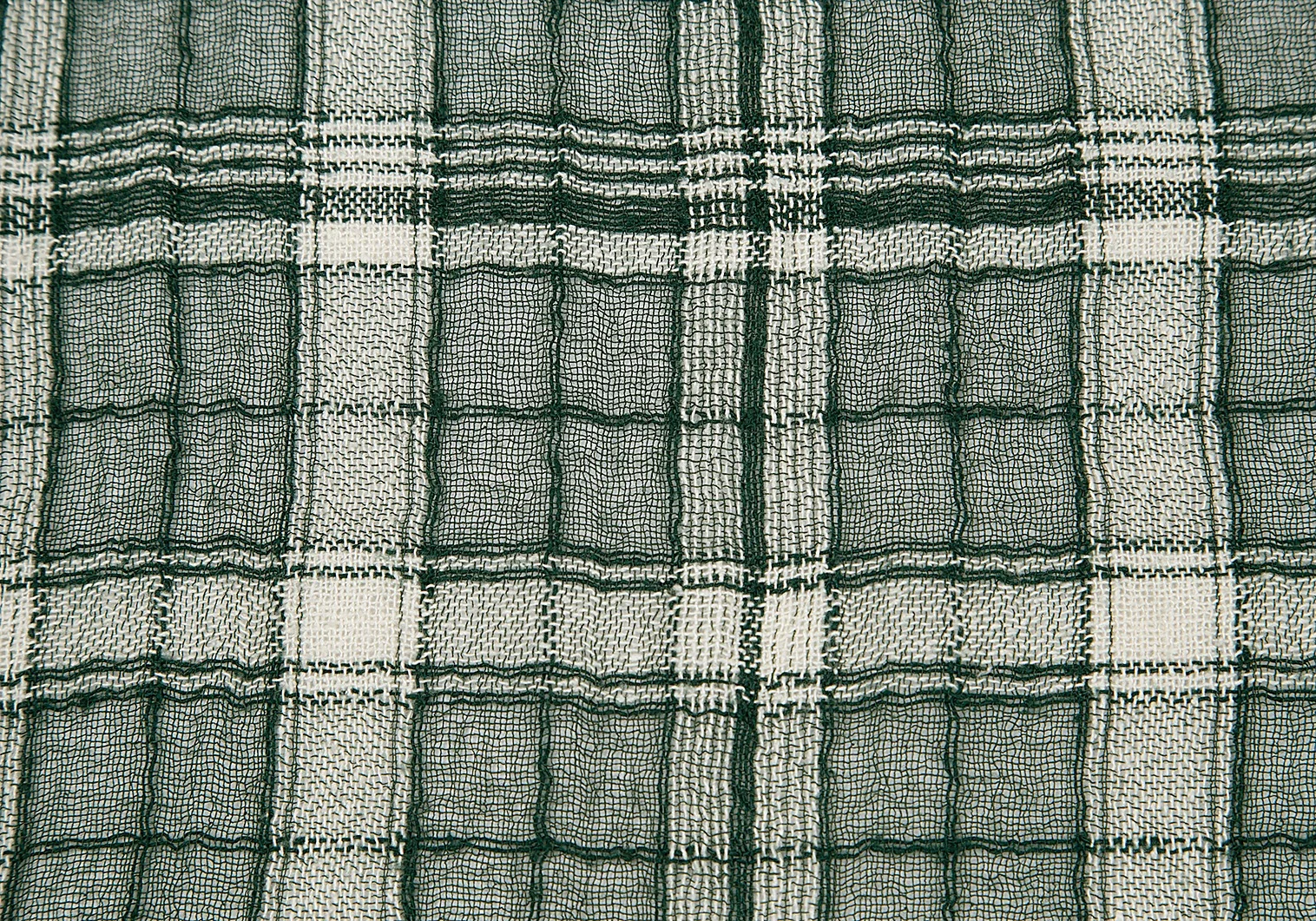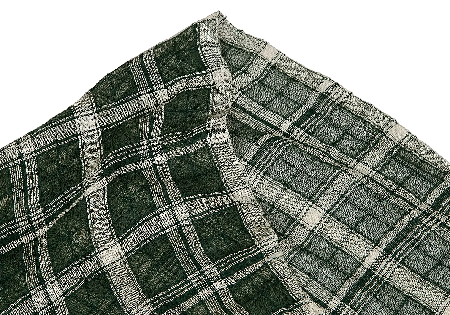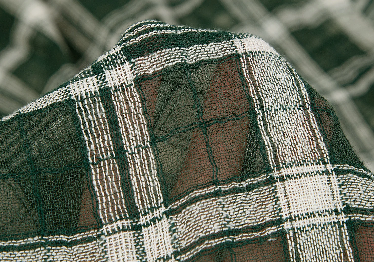 品質表示タグがありません。透け感のある生地です。目立ったシミ、汚れ、ほつれ等なくいい状態です。クリーニング済み