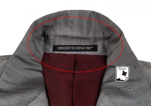 2009S/S。肩パッドあり。襟裏に薄汚れがあります(画像参照)。その他目立ったシミ、汚れ、ほつれ等なくいい状態です。クリーニング済み