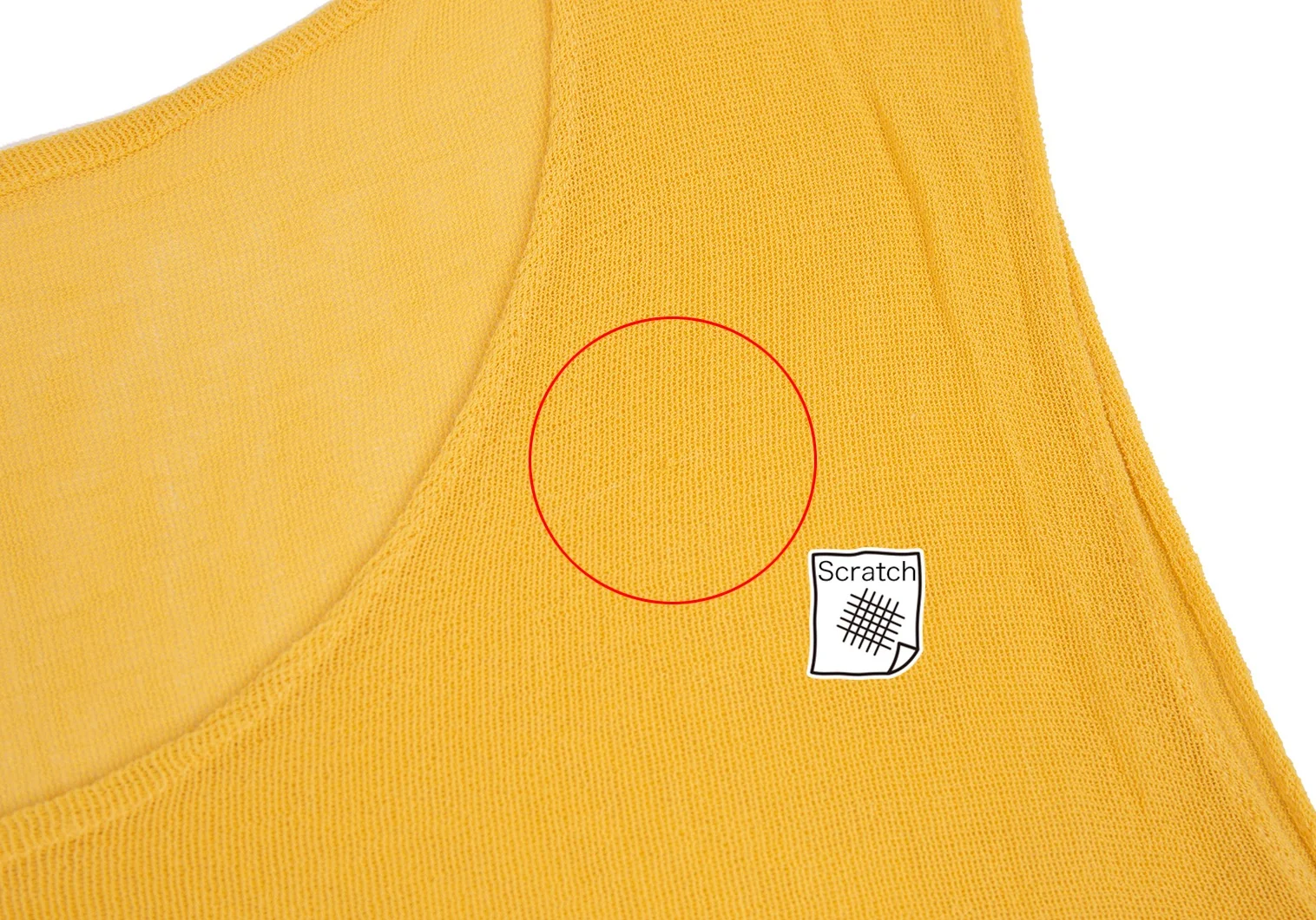 透け感があります。首元・前に引っ掛けがあります(写真参照)。その他に目立ったシミ、汚れ、ほつれ等なくいい状態です。クリーニング済み