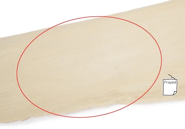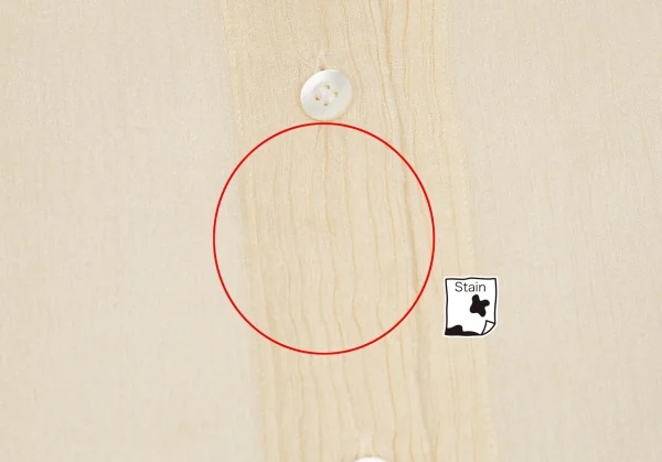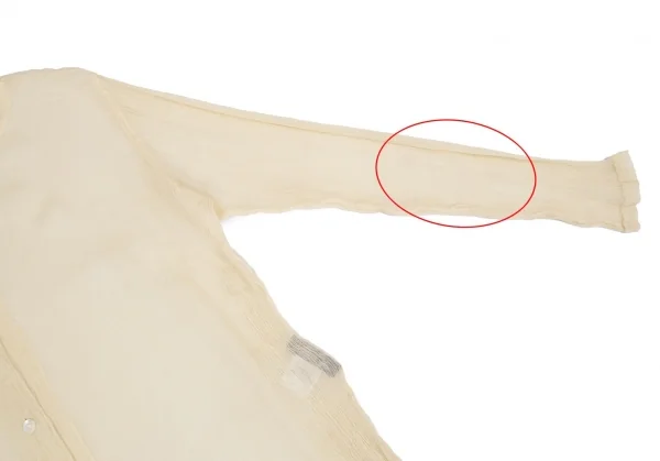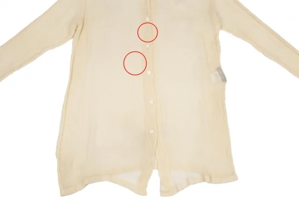 透け感のある生地です。右袖に引っ掛け、左袖・前身頃に薄シミがあります(画像参照)。その他目立ったシミ、汚れ、ほつれ等ありません。クリーニング済み
