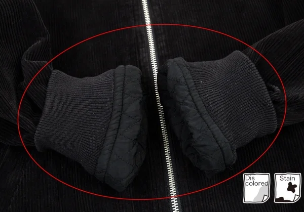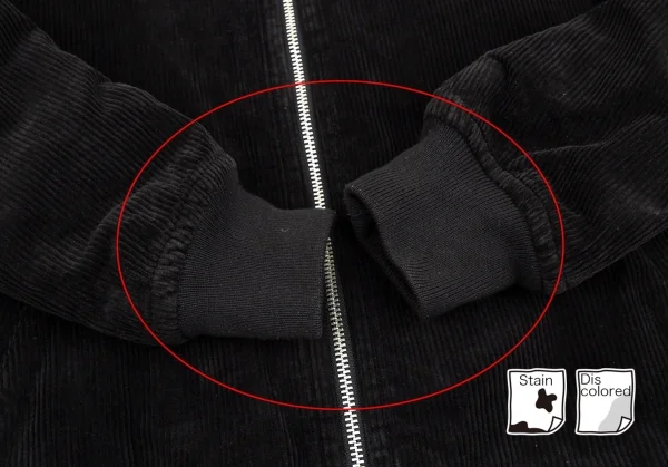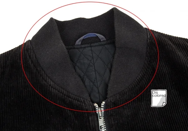 品質表示タグに劣化があり白い粉が付きます。首回りに色褪せ、袖先・袖裏に色褪せ・薄汚れ、裾エナメルに割れがあります(画像参照)。その他目立ったシミ、汚れ、ほつれ等ありません。クリーニング済み