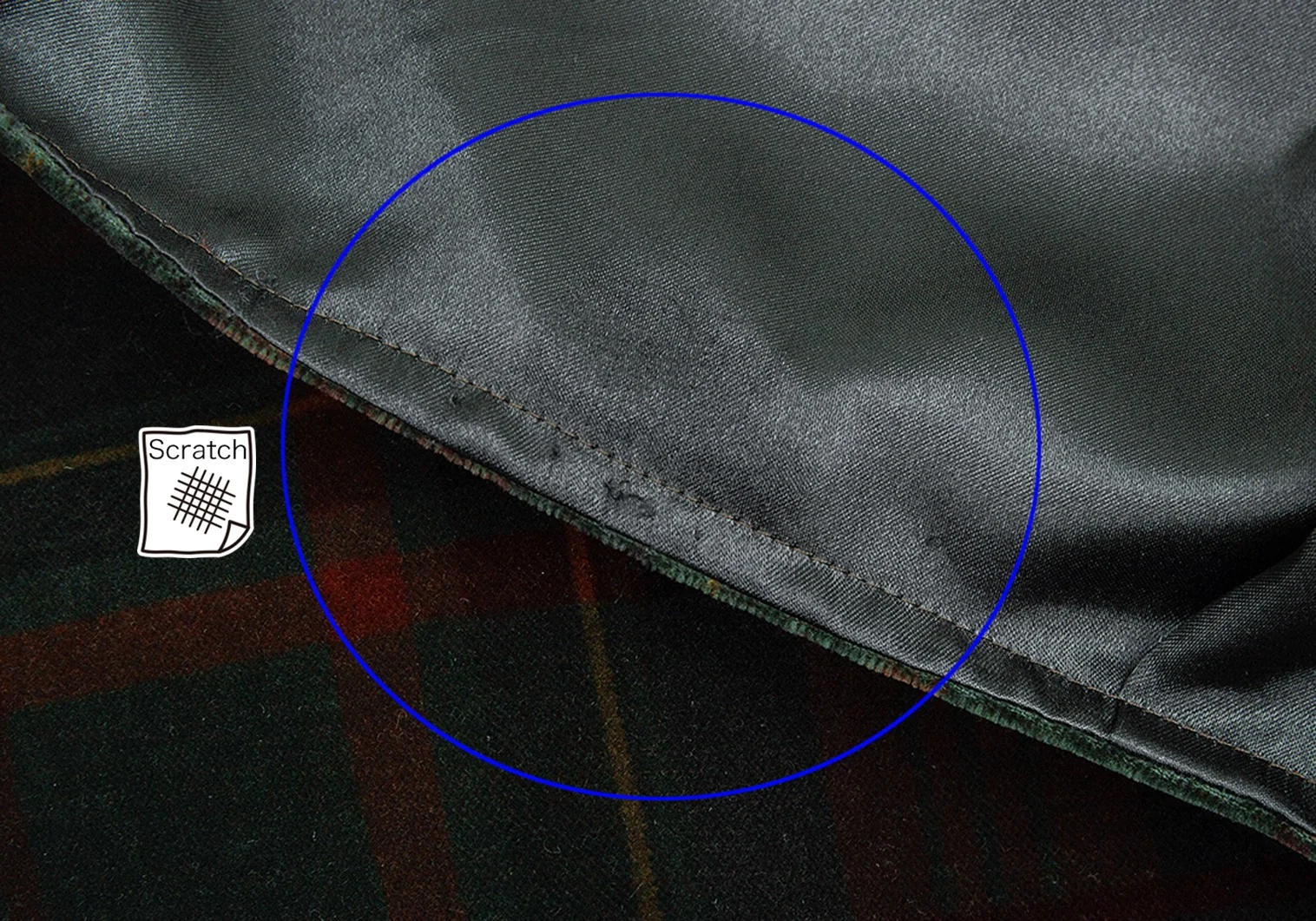 ブランドタグがありません。前上部に薄汚れ、ウエスト裏に引っ掛け、後ろ裾に毛抜け・縫い目の広がりがあります(画像参照)。その他目立ったシミ、汚れ、ほつれ等ありません。クリーニング済み