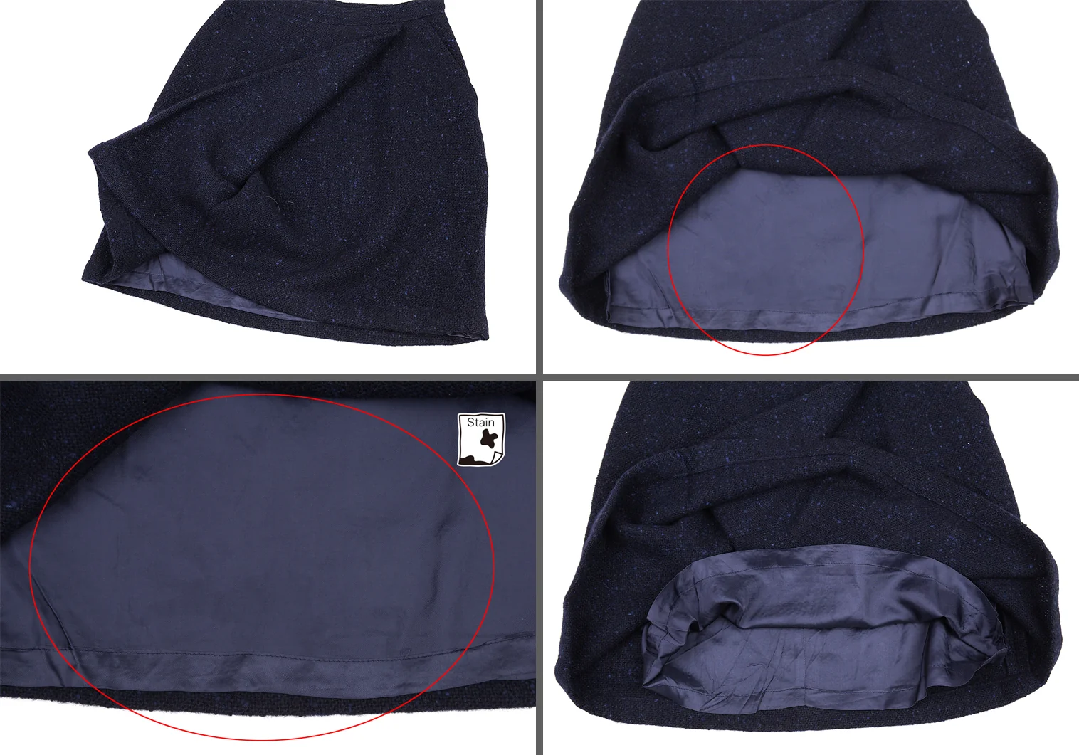 ジャケット:肩パッドあり。袖裏に汚れ、ベルト留め具が欠品しております。スカート:裏地に薄シミがあります。(写真参照)その他に目立ったシミ、汚れ、ほつれ等なくいい状態です。クリーニング済み