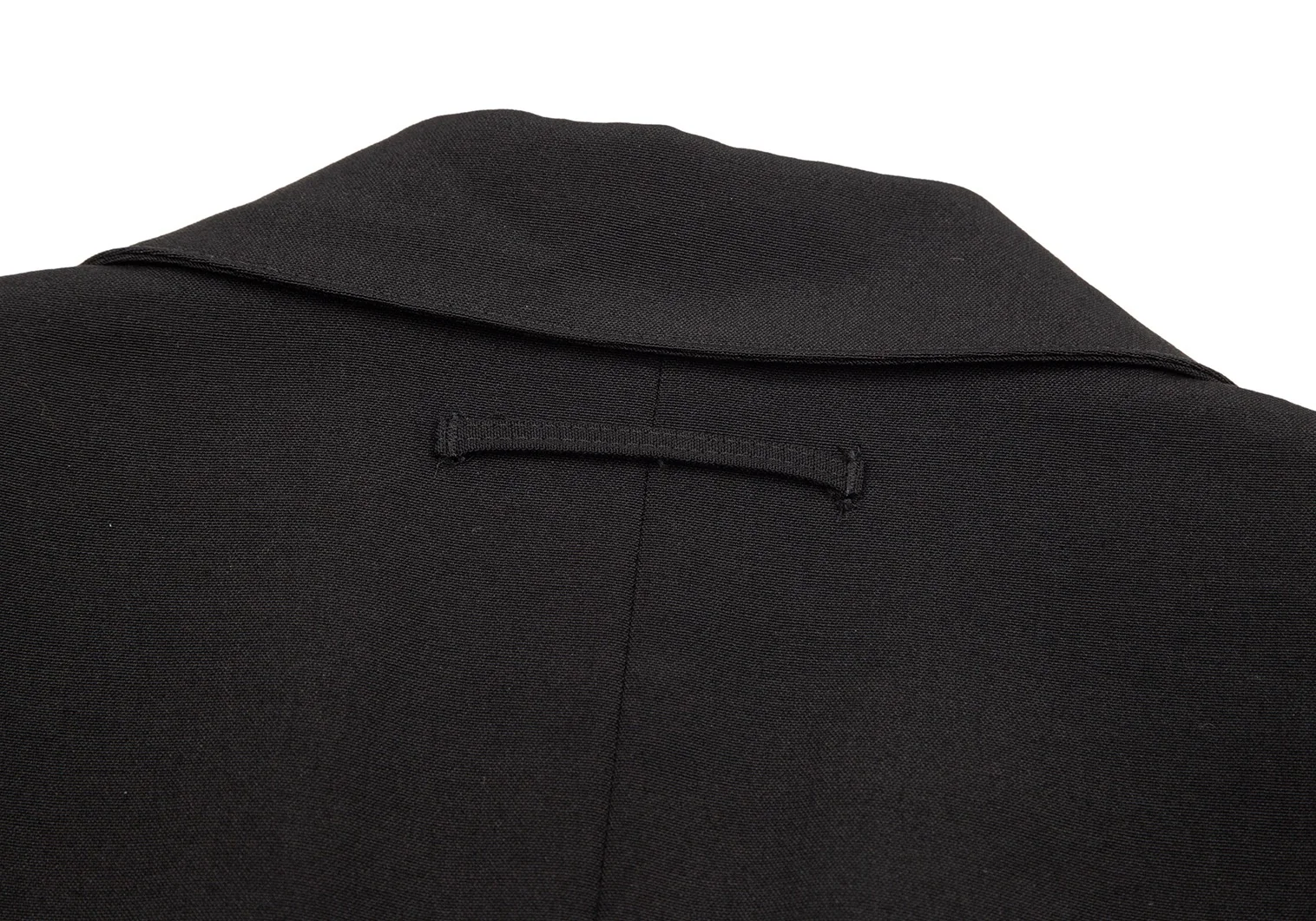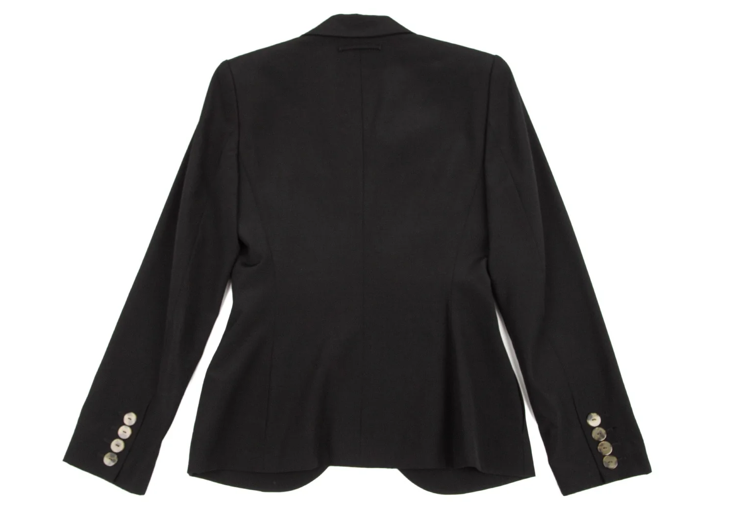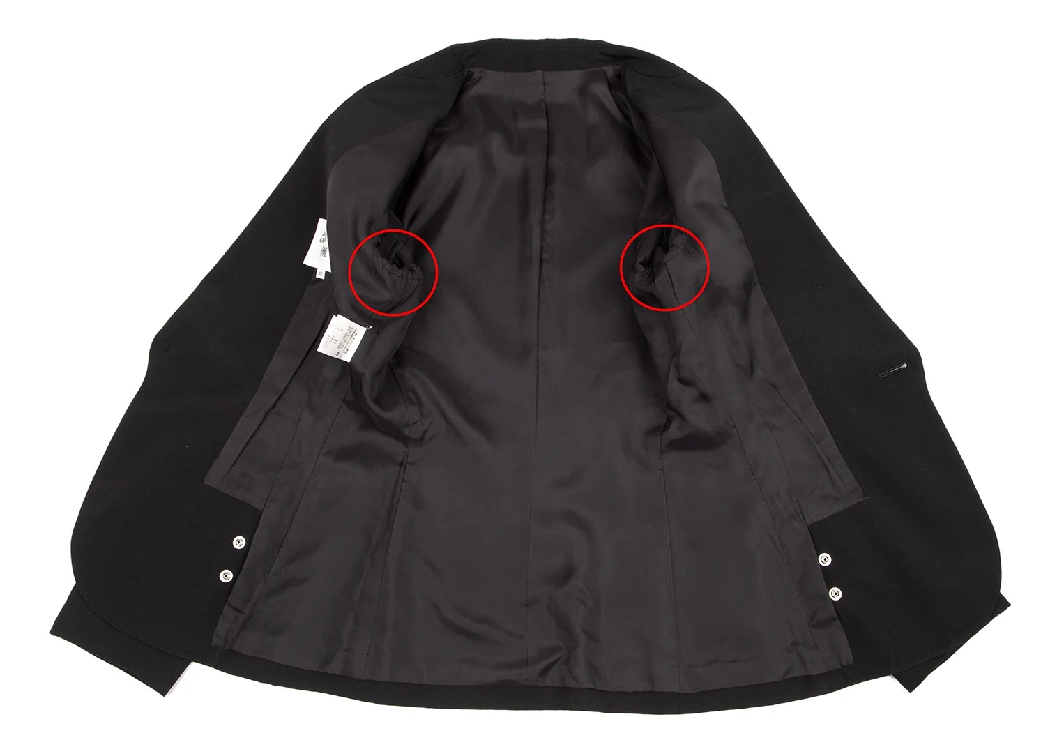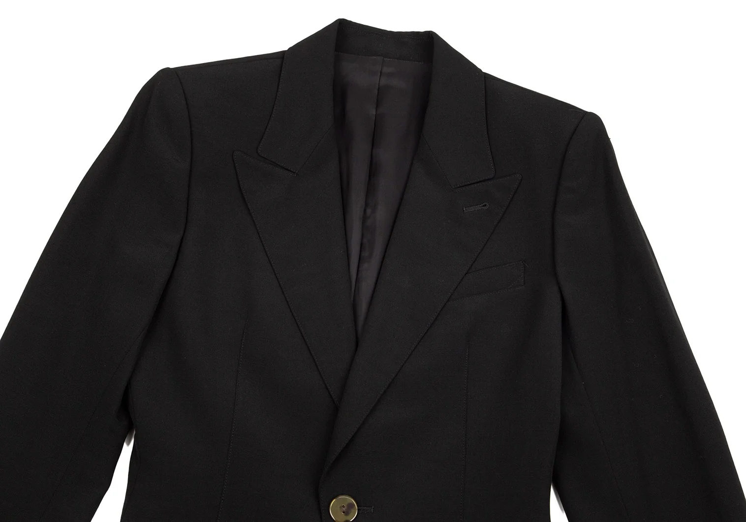 肩パッドあり。付属品が欠品しています。ポケットはありません。袖先にテカリ、袖裏にテカリ・薄汚れ、脇裏にスレがあります(画像参照)。その他目立ったシミ、汚れ、ほつれ等なくいい状態です。クリーニング済み