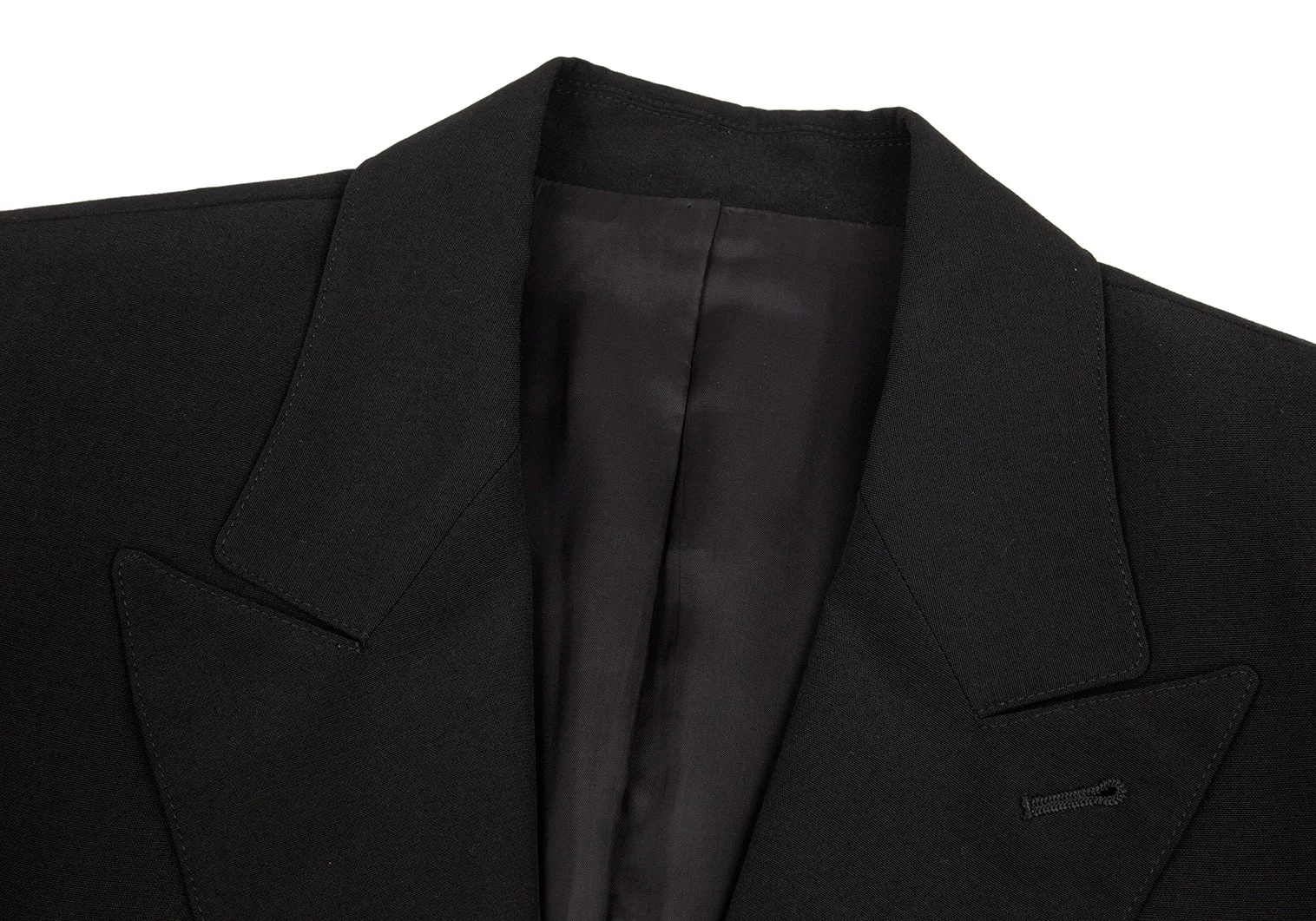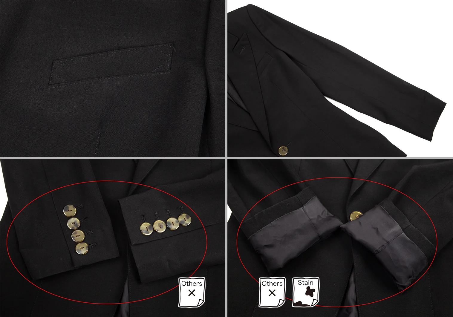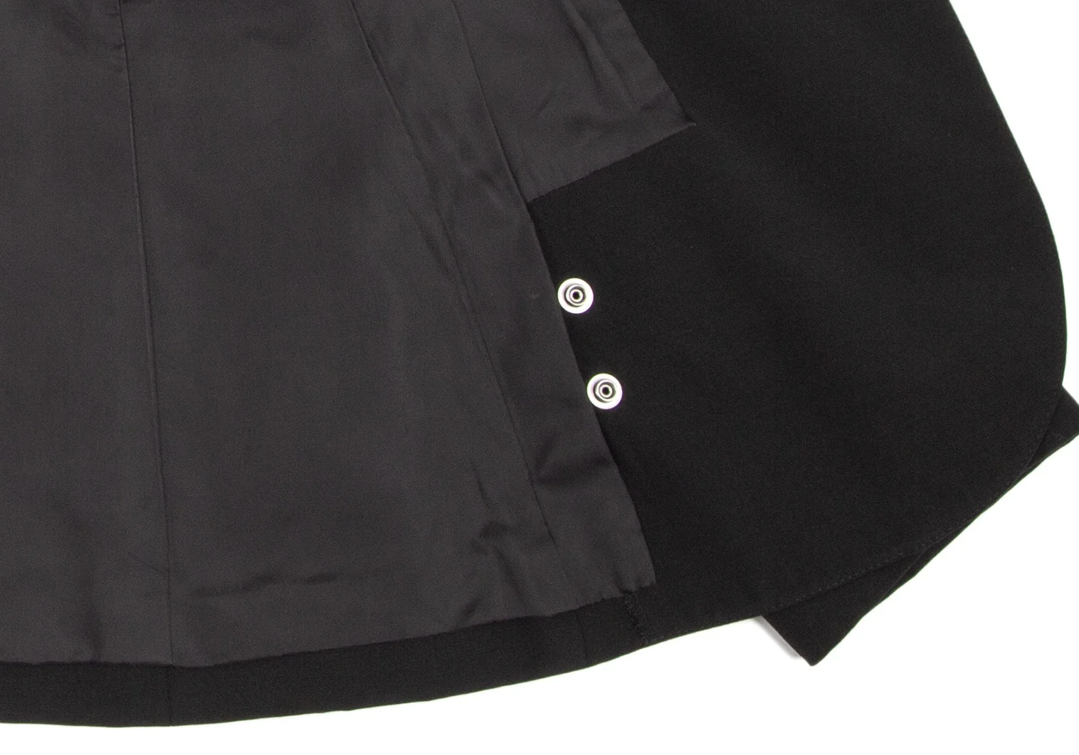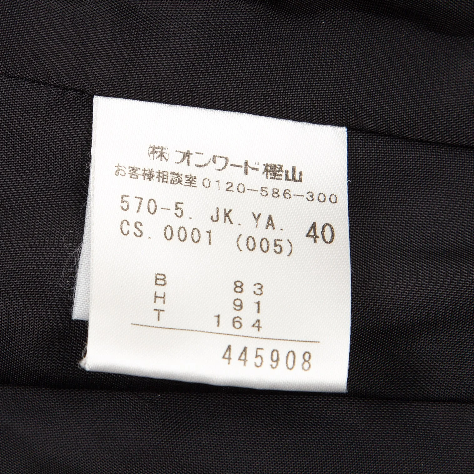 肩パッドあり。付属品が欠品しています。ポケットはありません。袖先にテカリ、袖裏にテカリ・薄汚れ、脇裏にスレがあります(画像参照)。その他目立ったシミ、汚れ、ほつれ等なくいい状態です。クリーニング済み