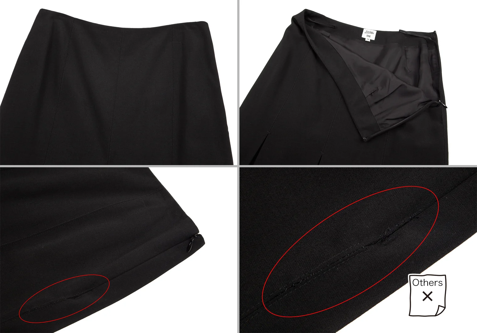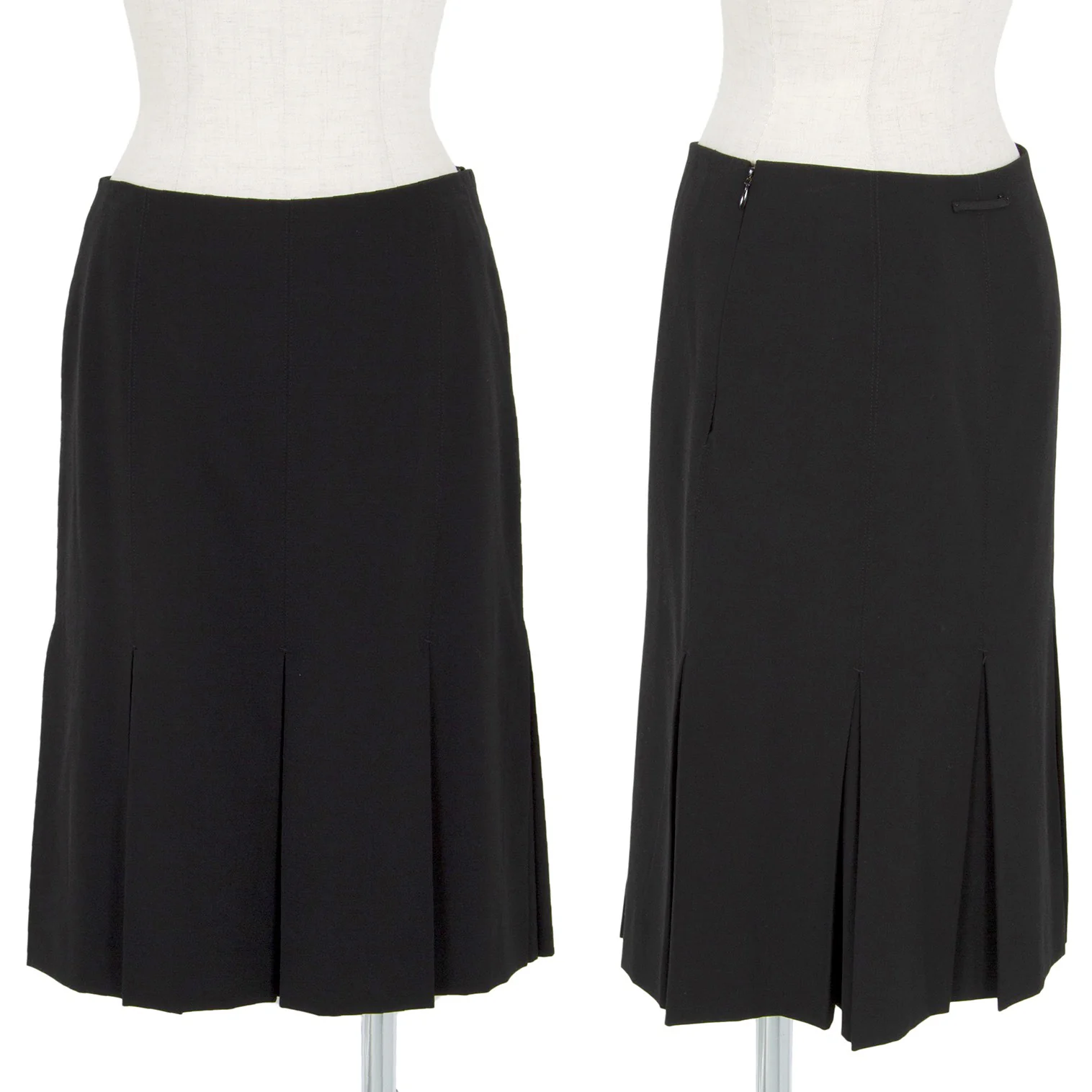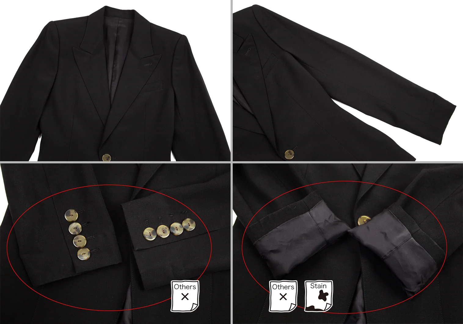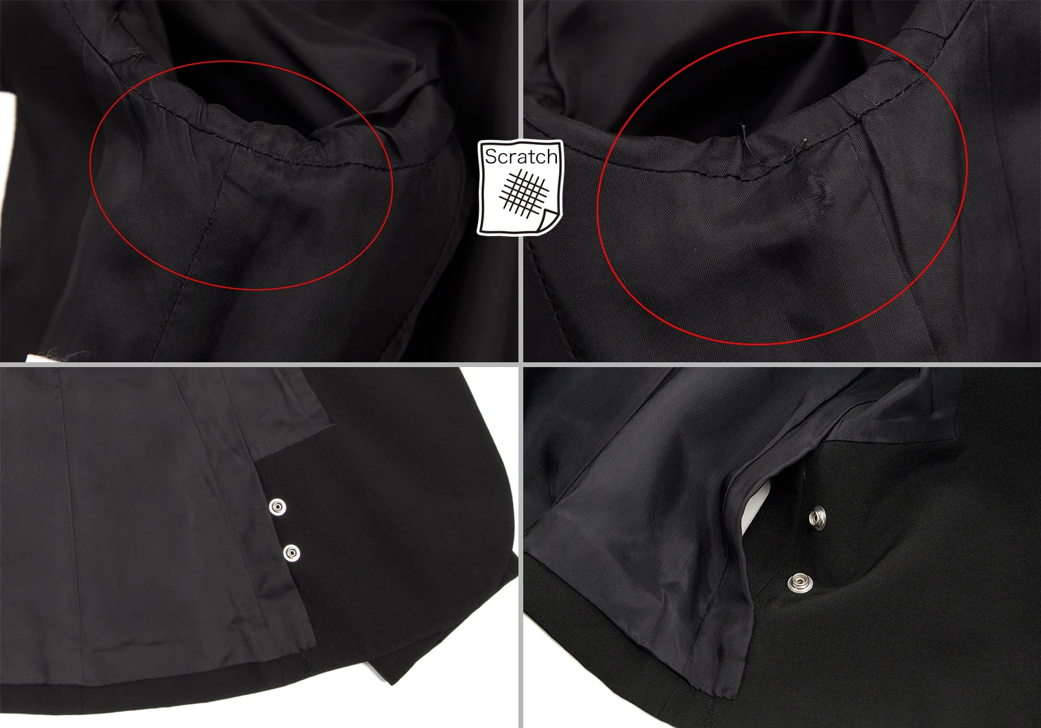 ジャケット:肩パッドあり。付属品が欠品しています。ポケットはありません。袖先にテカリ、袖裏にテカリ・薄汚れ、脇裏にスレがあります。スカート:ジップ部分に補修後があります(画像参照)。その他目立ったシミ、汚れ、ほつれ等なくいい状態です。クリーニング済み