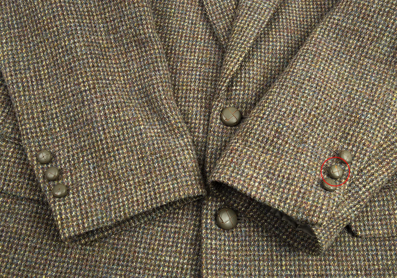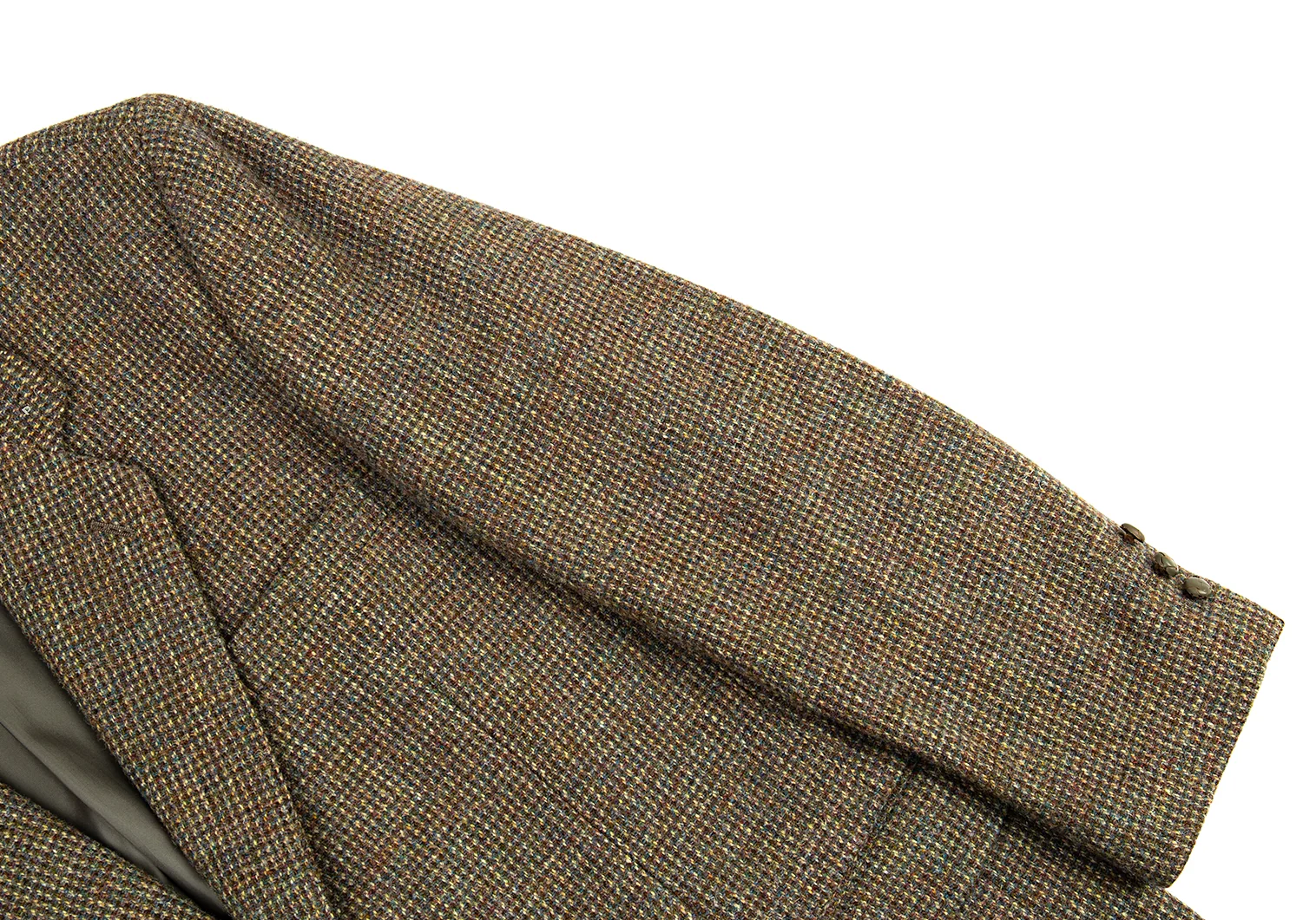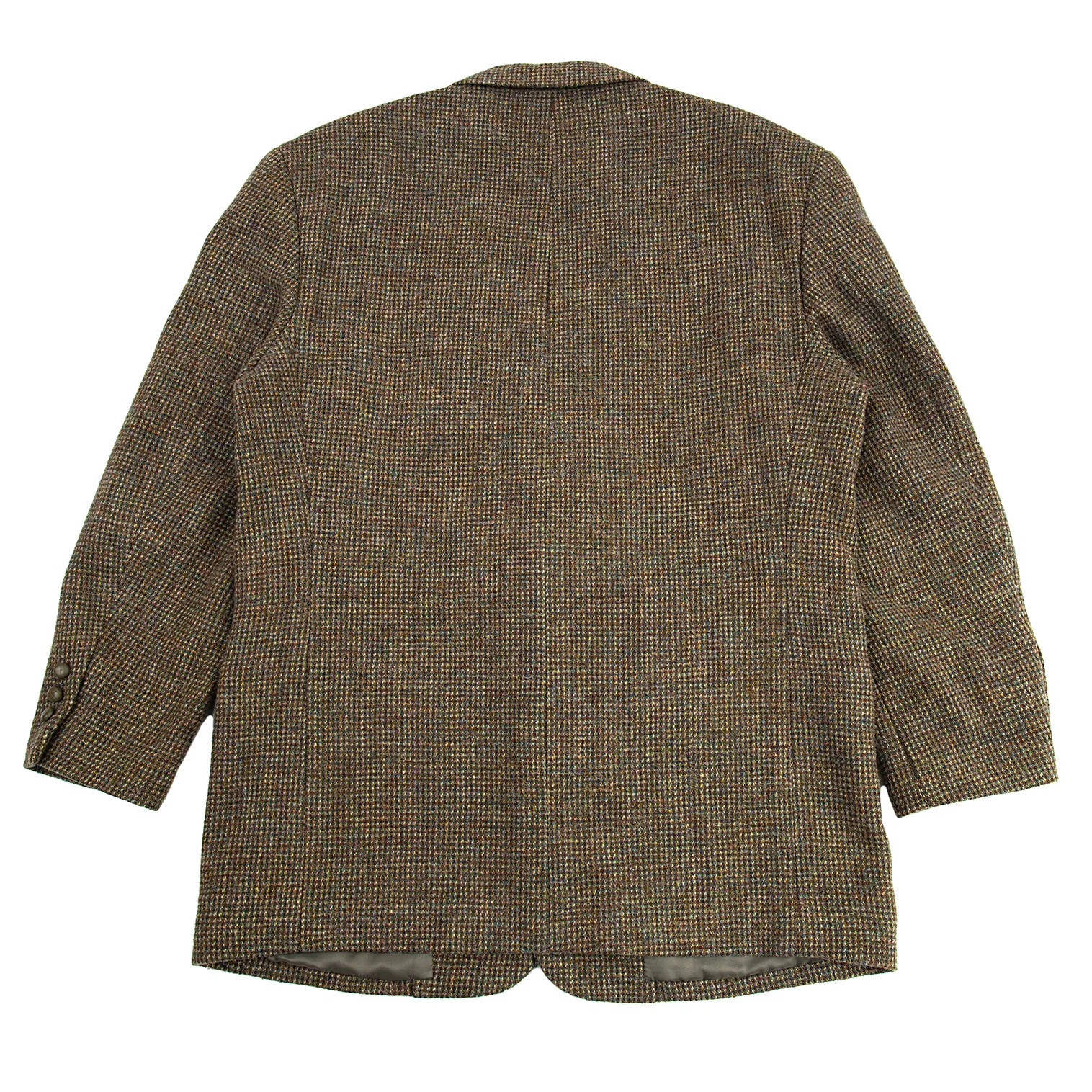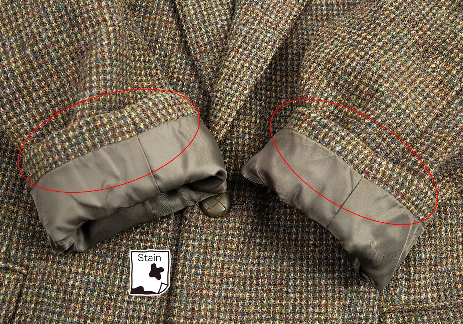 肩パッドあり。袖裏に薄汚れ、左袖くるみボタンに軽微なダメージがあります(画像参照)。その他目立ったシミ、汚れ、ほつれ等ありません。クリーニング済み