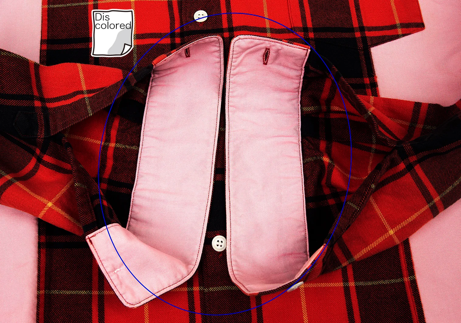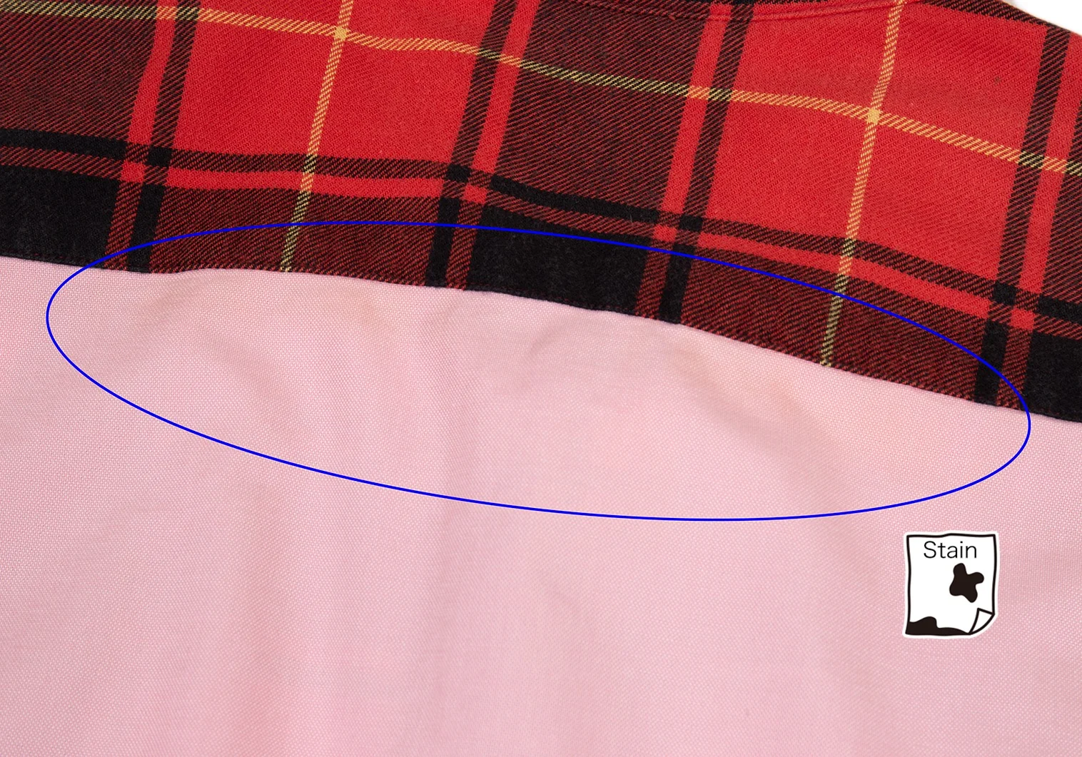 品質表示タグに劣化があります。両肩切り替え部分に色移り、袖裏に少し色褪せ、背中一部汚れ、切り替え部分色移りがあります(画像参照)。その他目立ったシミ、汚れ、ほつれ等ありません。クリーニング済み