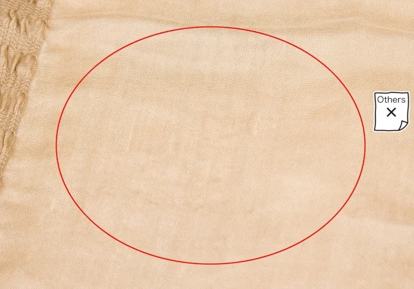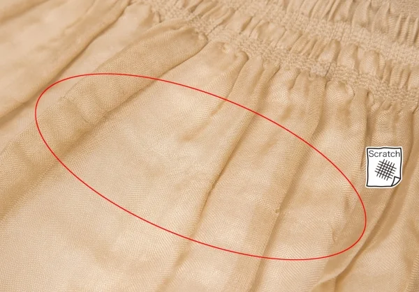 透け感のある生地です。全体的に生地のヨレあり、一部引っ掛けがあります(画像参照)。その他目立ったシミ、汚れ、ほつれ等ありません。クリーニング済み