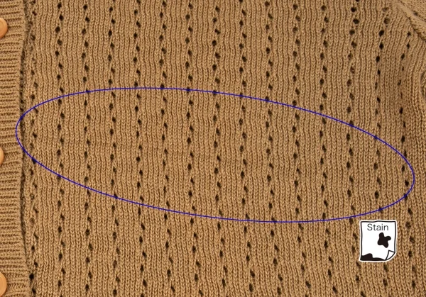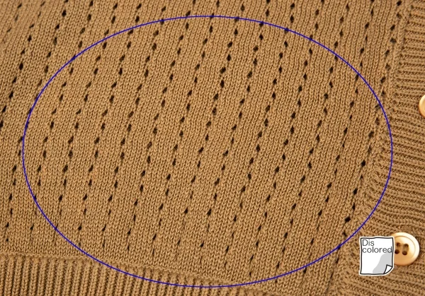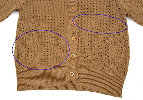 編み目から内側が見えます。前裾に薄汚れ、少し変色があります(画像参照)。その他目立ったシミ、汚れ、ほつれ等ありません。クリーニング済み