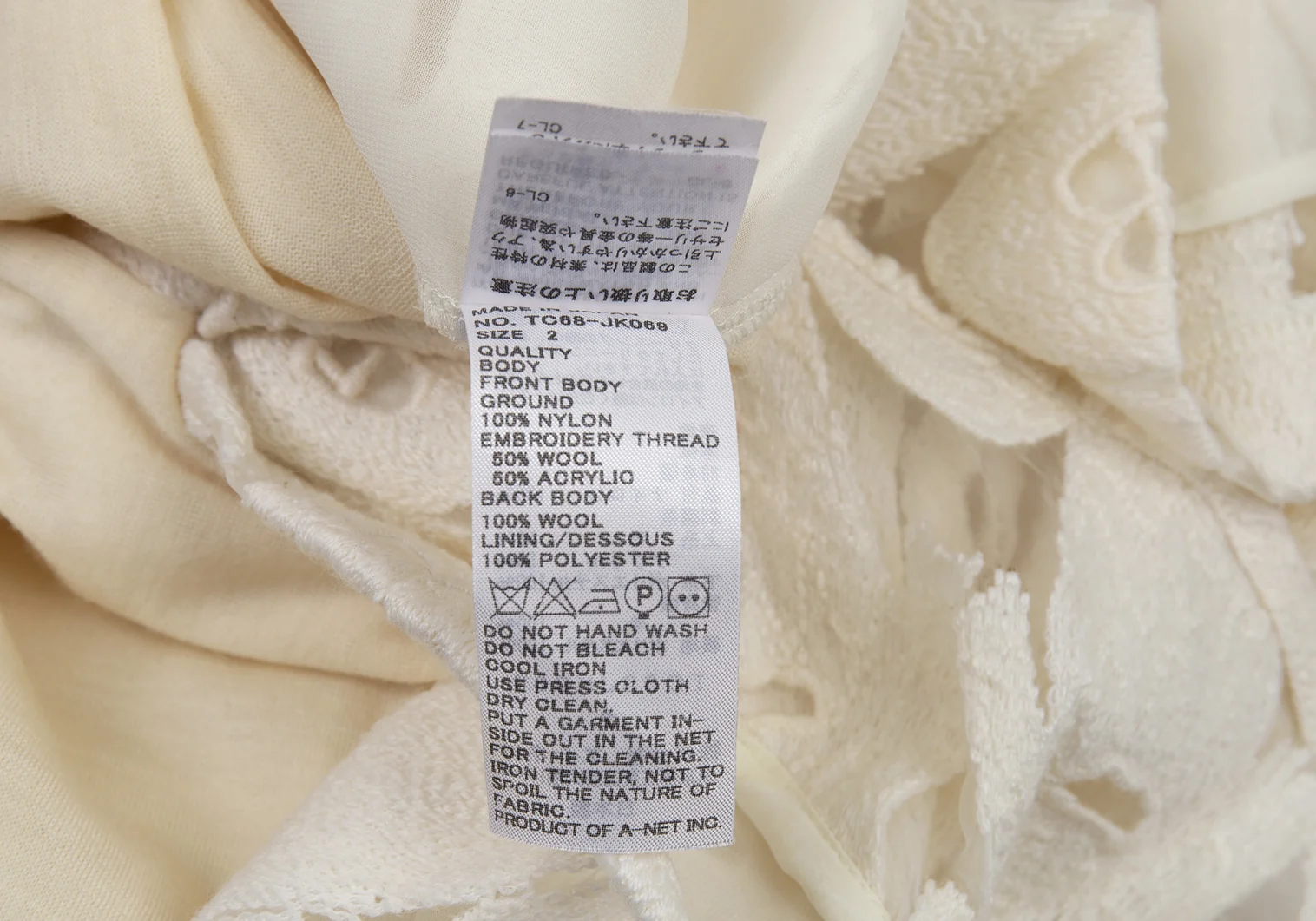 表地 本体 前身頃 基布 ナイロン 100% 刺繍糸 上糸 毛50% アクリル50% 下糸 ポリエステル100% 後身頃 毛100% 裏地 ポリエステル100%