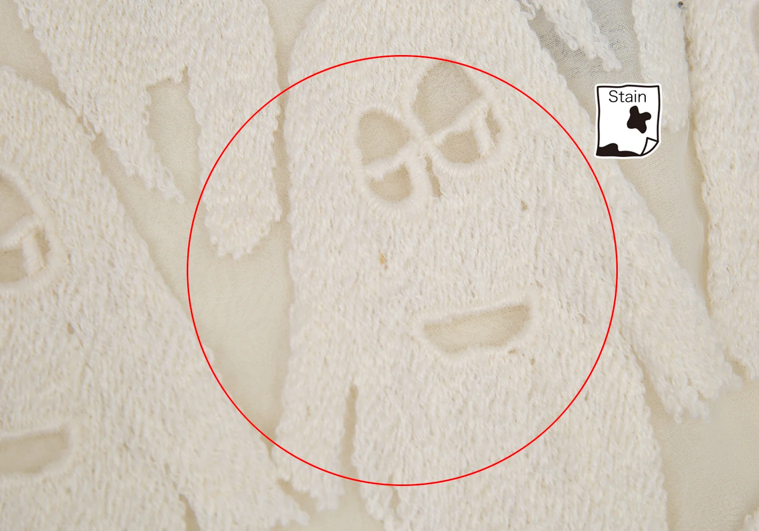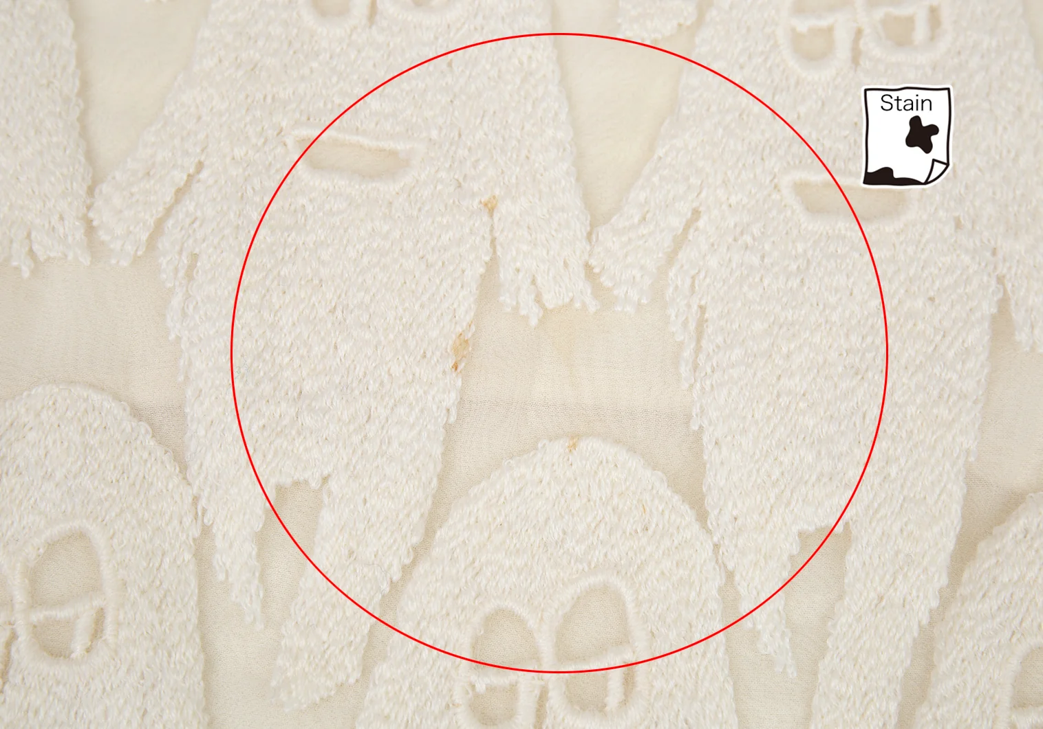 若干の透け感があります。首元・前裾にシミがあります(写真参照)。その他に目立ったシミ、汚れ、ほつれ等はありません。クリーニング済み
