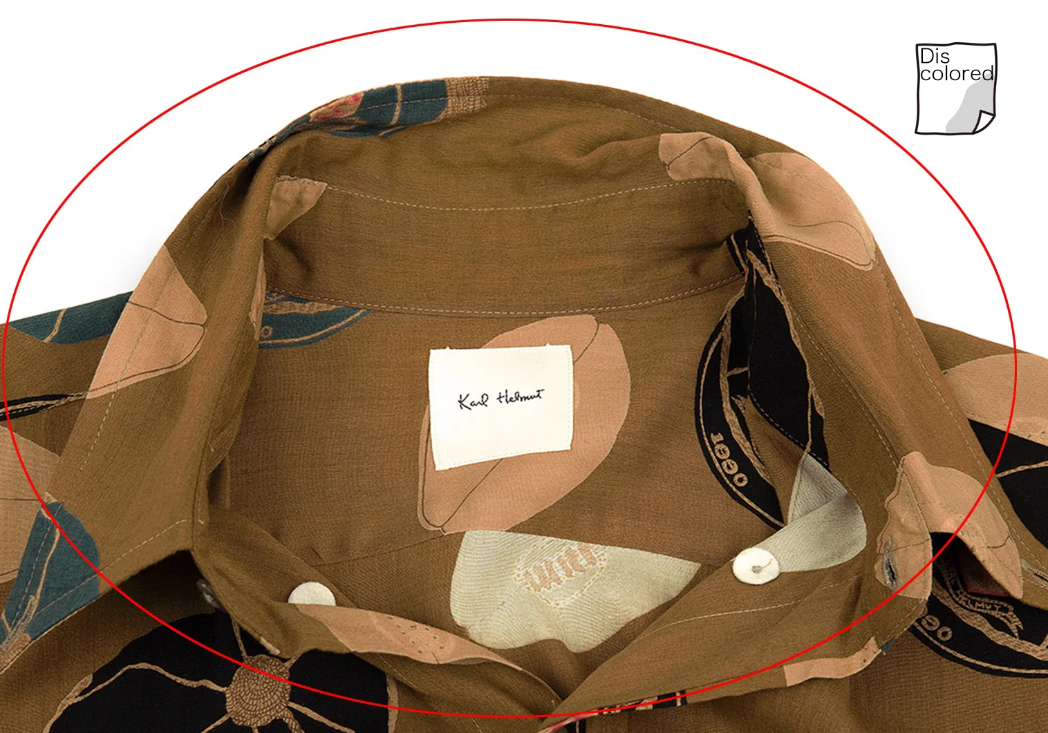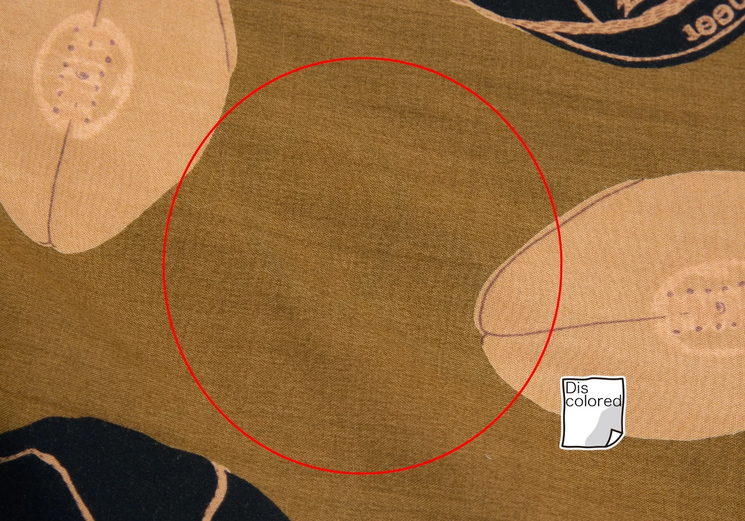胸元・首回り・左袖に変色、ブランドタグに薄シミがあります(画像参照)。その他目立ったシミ、汚れ、ほつれ等ありません。クリーニング済み