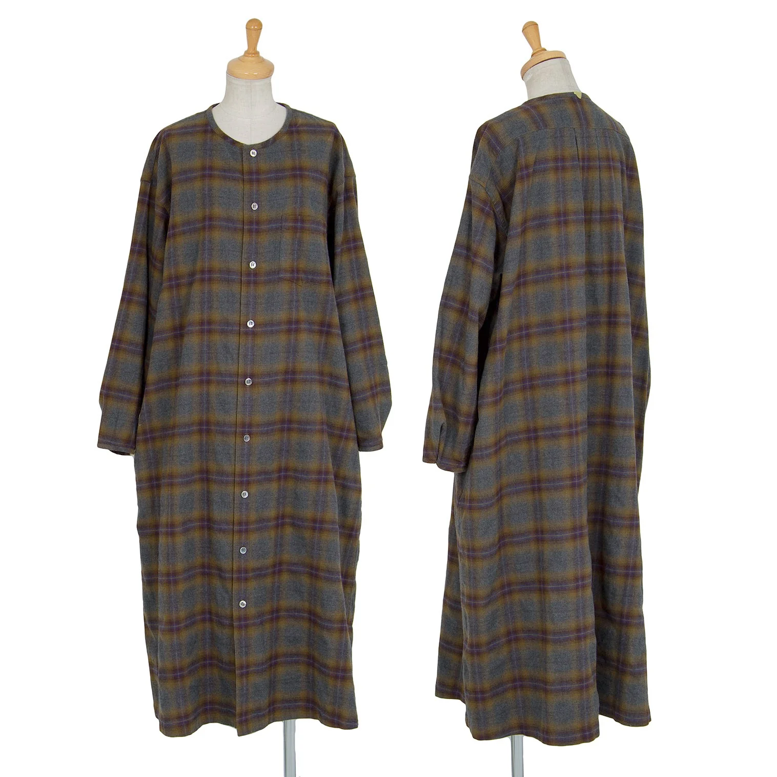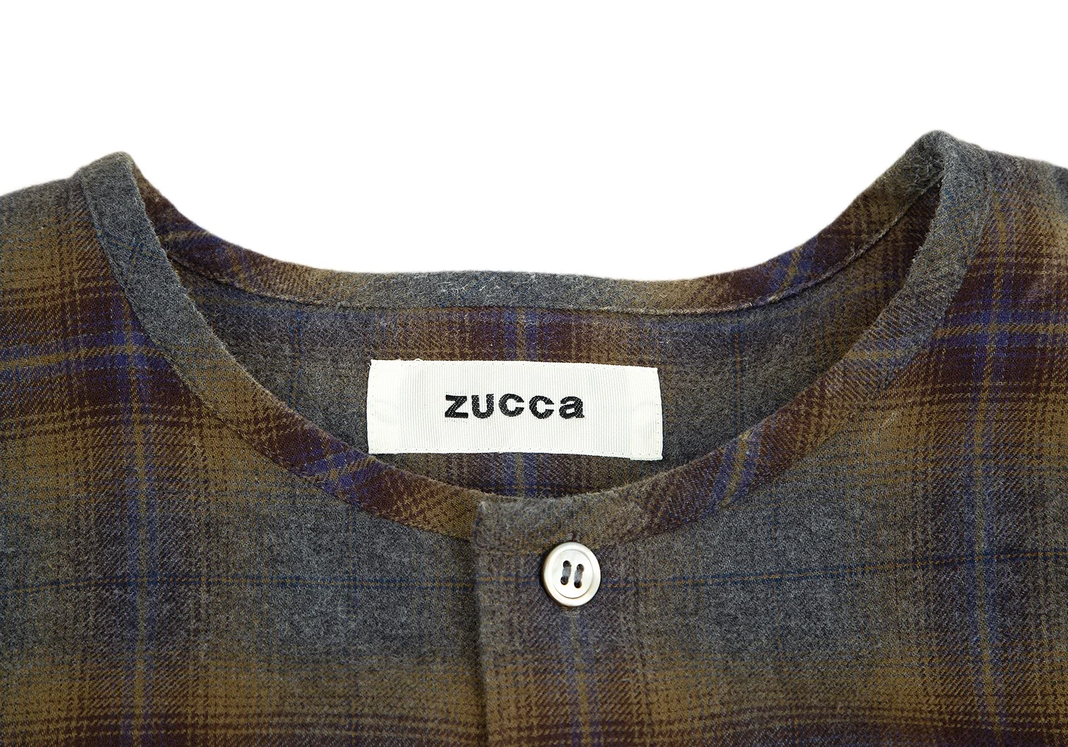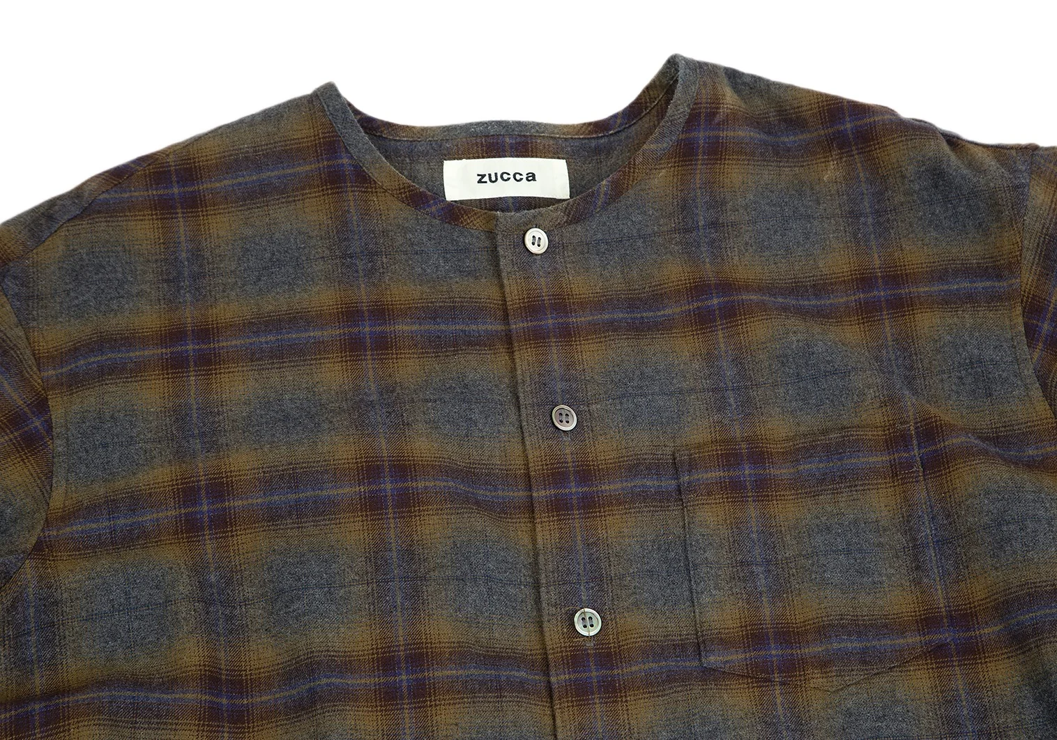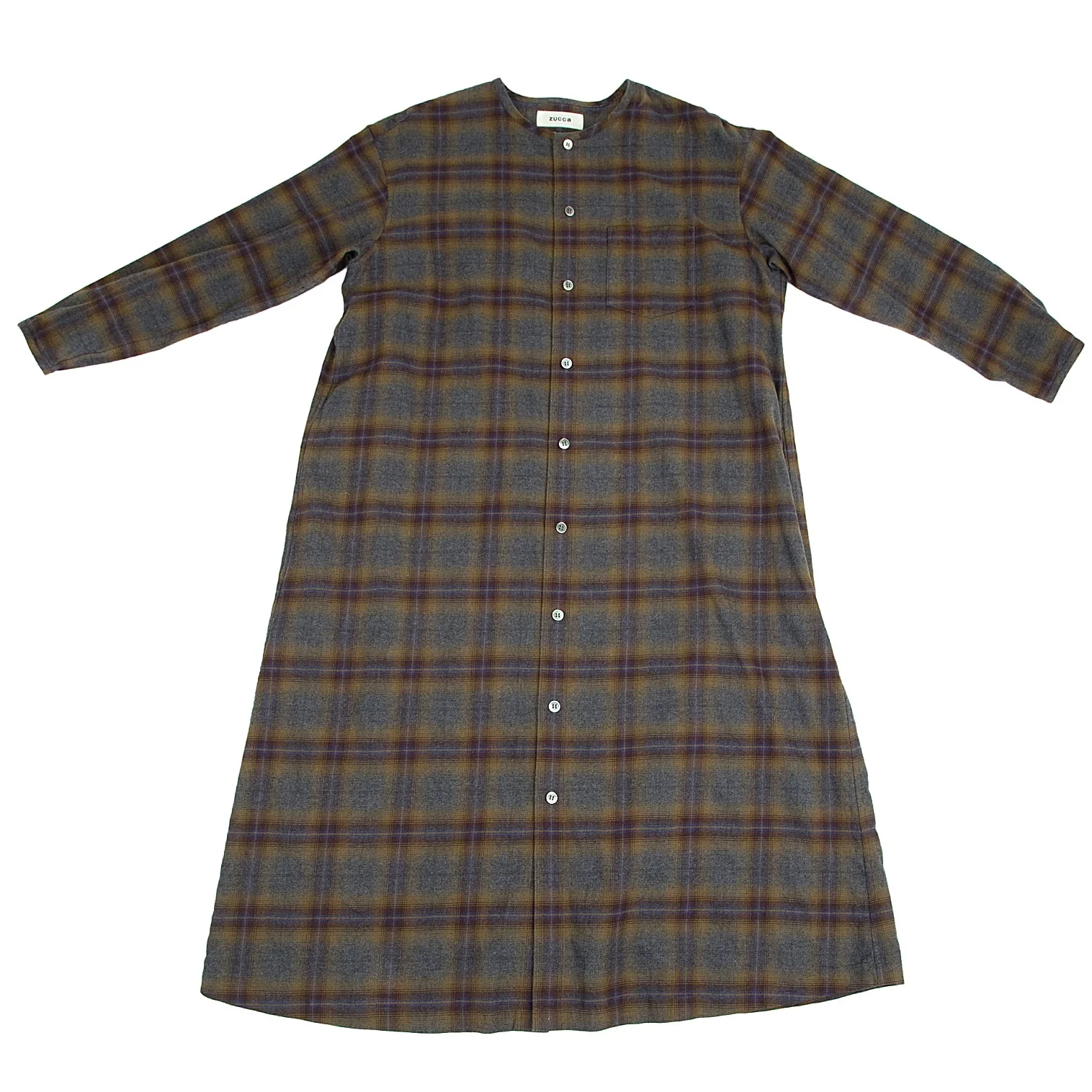 ズッカzucca ノーカラーチェックネルシャツワンピース 茶グレーM