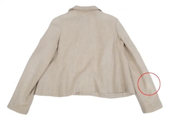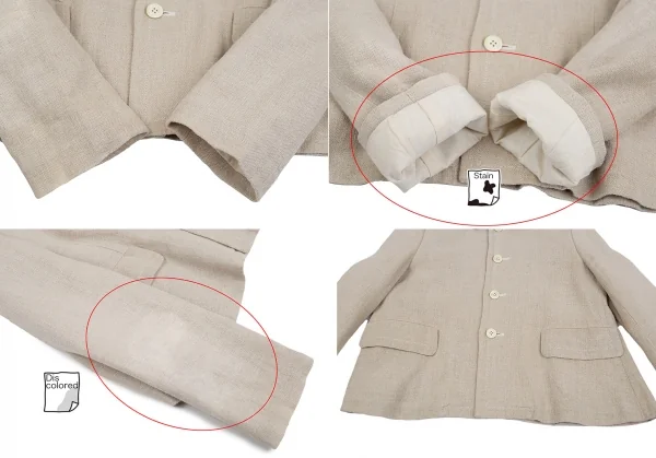 ジャケット右袖に色抜け、袖裏に薄汚れがあります(写真参照)その他目立ったシミ、汚れ、ほつれ等はないです。クリーニング済み