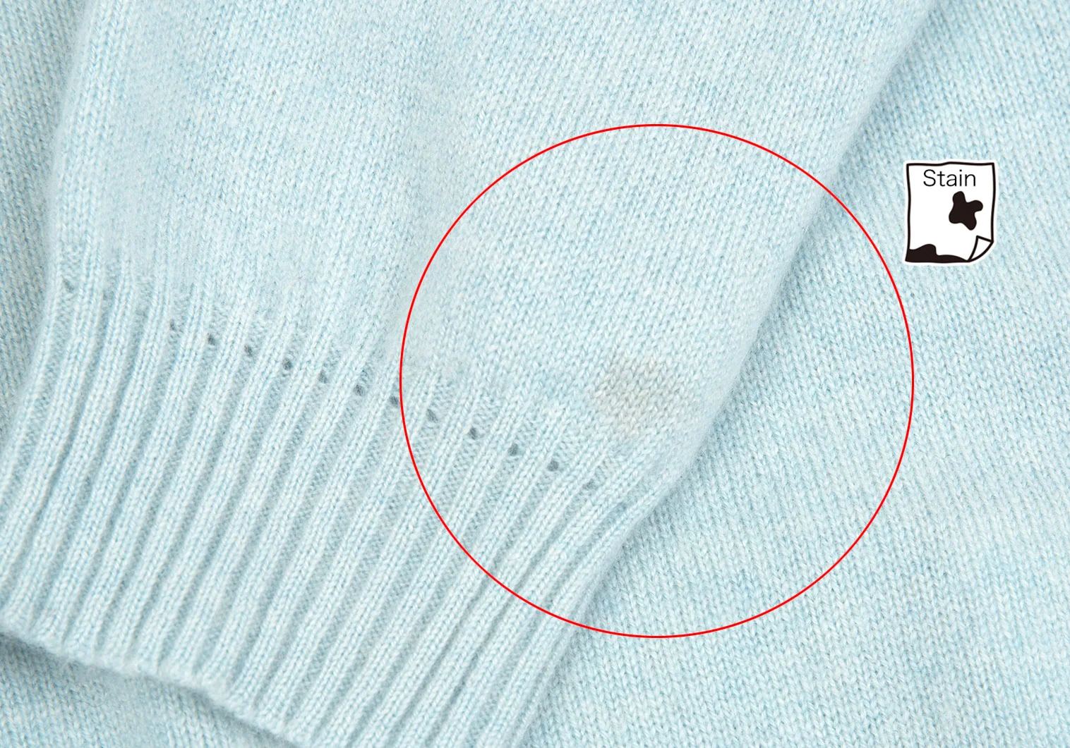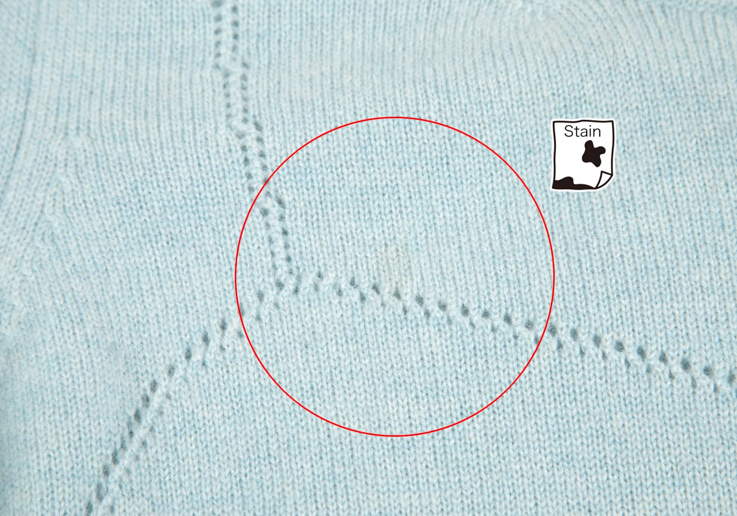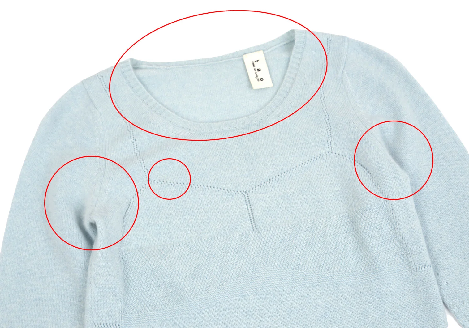 首周り・前に薄シミ、脇下に擦れ・毛羽立ち、左袖先にシミがあります(写真参照)。その他に目立ったシミ、汚れ、ほつれ等はありません。クリーニング済み