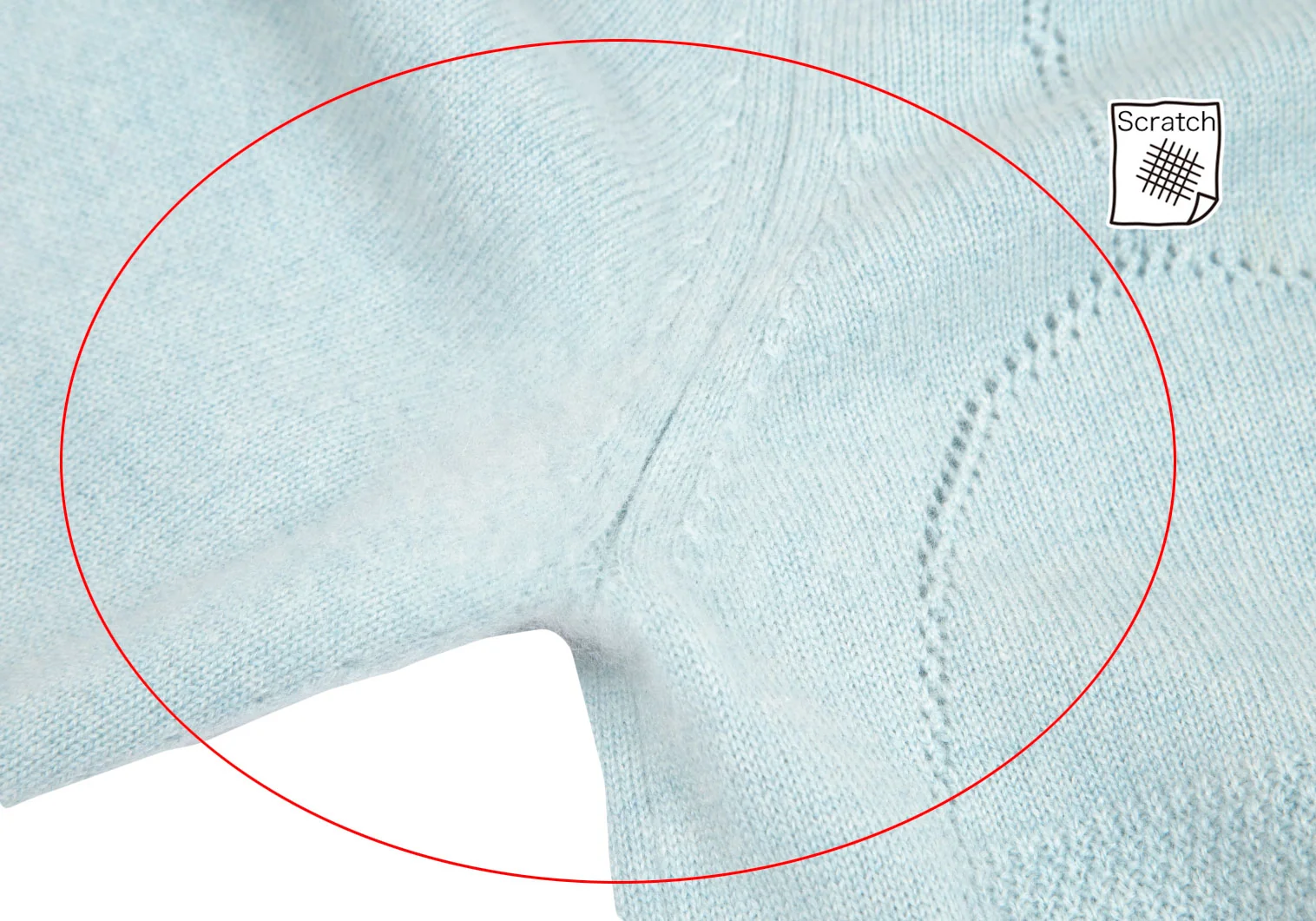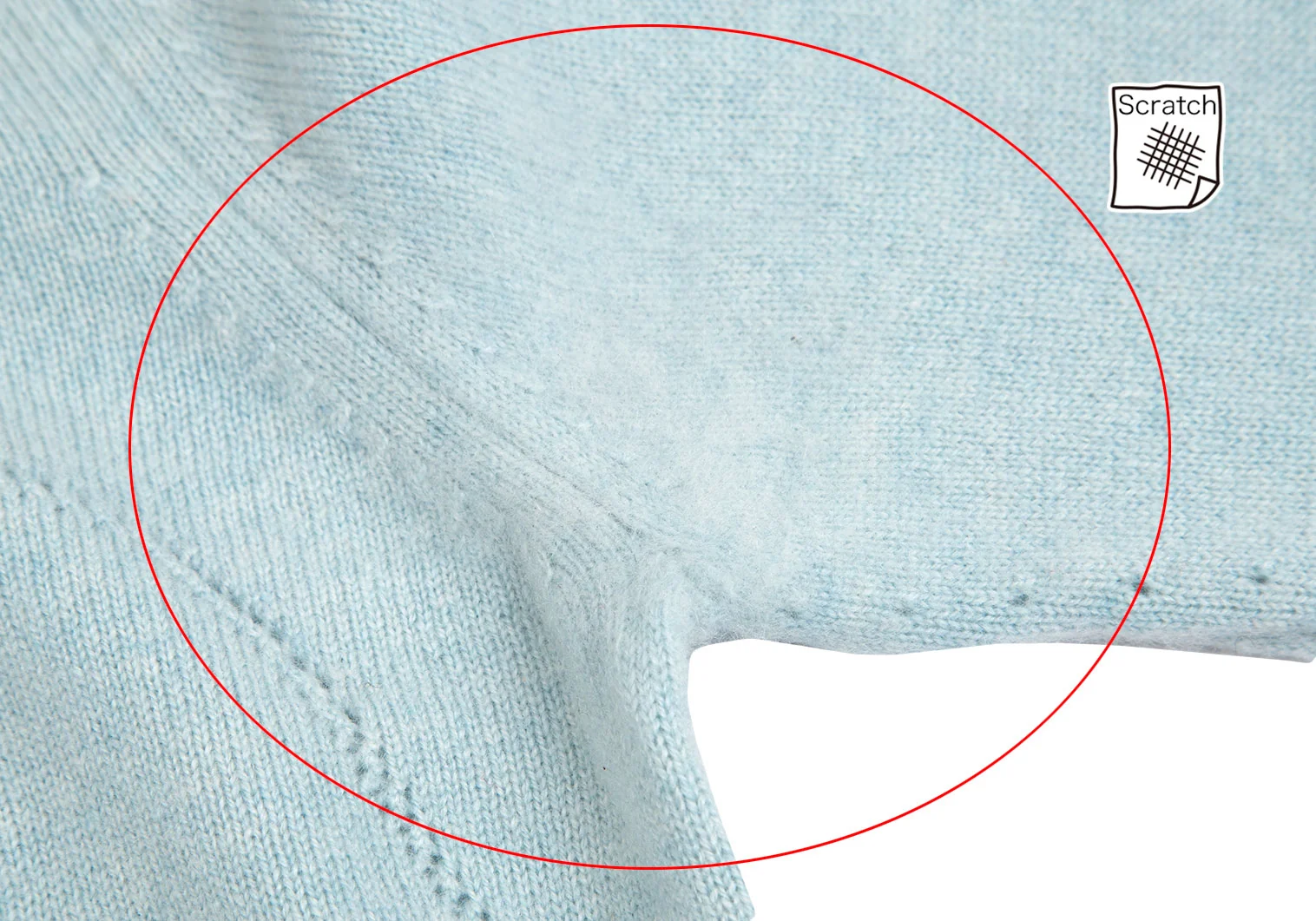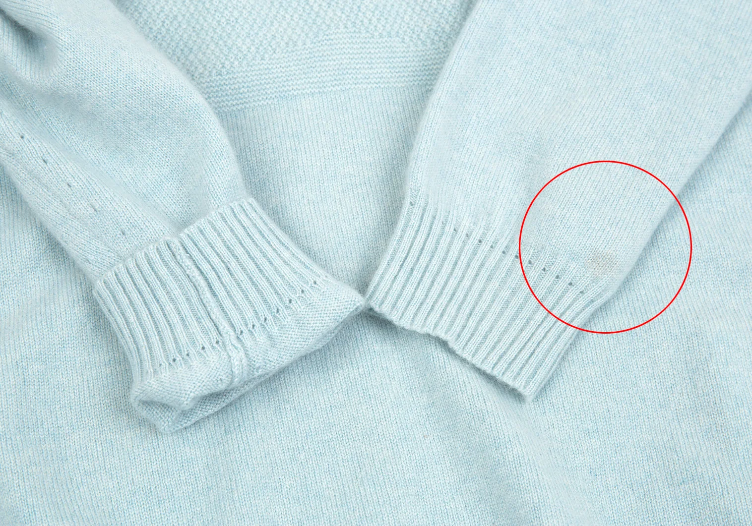 首周り・前に薄シミ、脇下に擦れ・毛羽立ち、左袖先にシミがあります(写真参照)。その他に目立ったシミ、汚れ、ほつれ等はありません。クリーニング済み