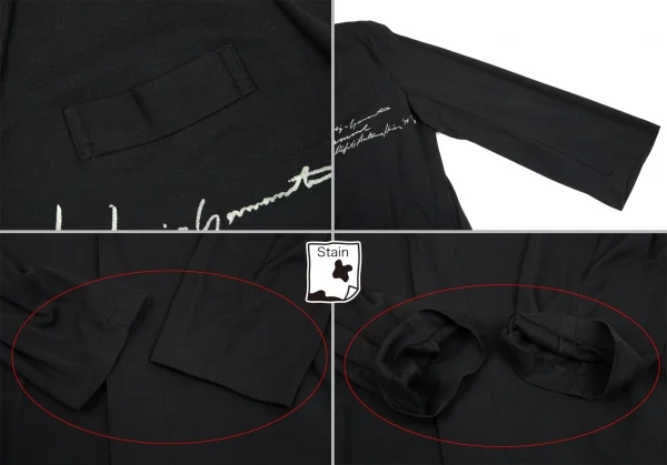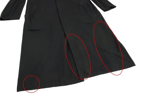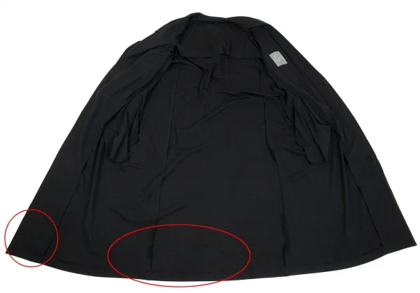 品質表示タグがありません。袖先・袖裏に薄シミ・汚れ、前後裾・裾裏にシミ・変色があります(画像参照)。その他目立ったシミ、汚れ、ほつれ等ありません。クリーニング済み