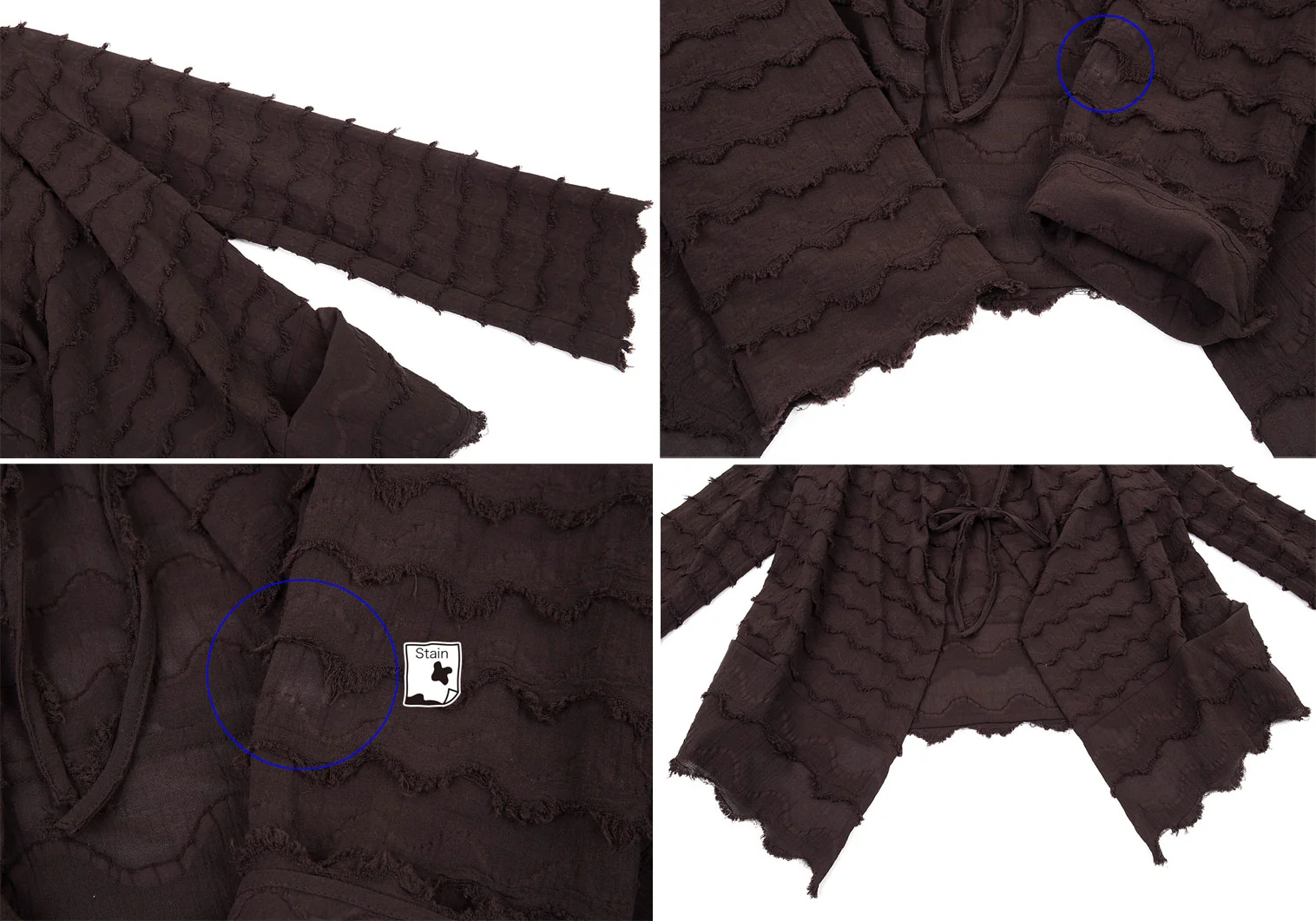 カーディガン:透け感のある生地です。左袖に薄汚れがあります。スカート:前面・裾裏に変色があります(画像参照)。その他目立ったシミ、汚れ、ほつれ等ありません。クリーニング済み