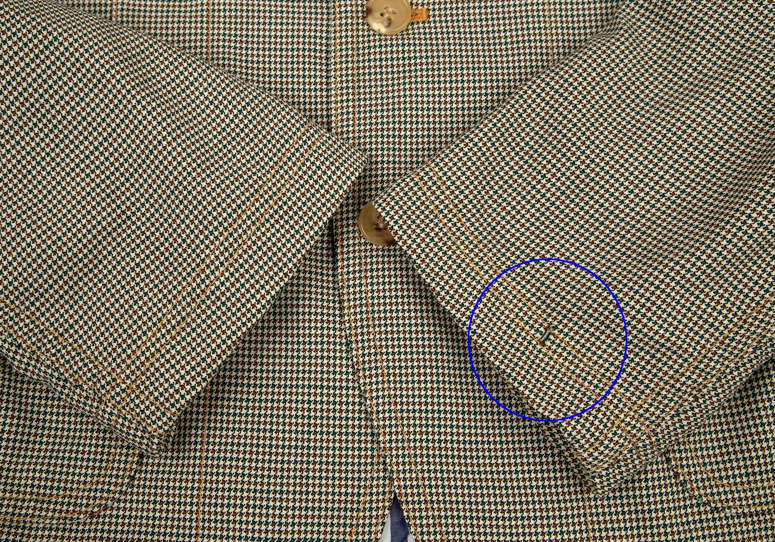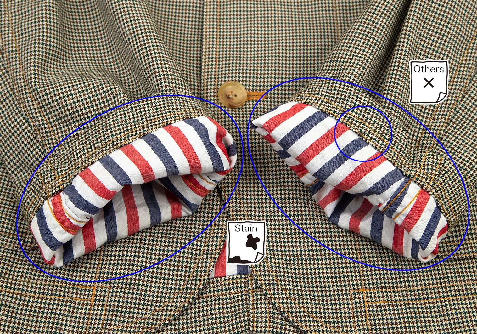 首裏・袖口・袖裏・脇裏にシミ、左袖先に破れ、左袖裏にダメージがあります(画像参照)。その他目立ったシミ、汚れ、ほつれ等ありません。クリーニング済み