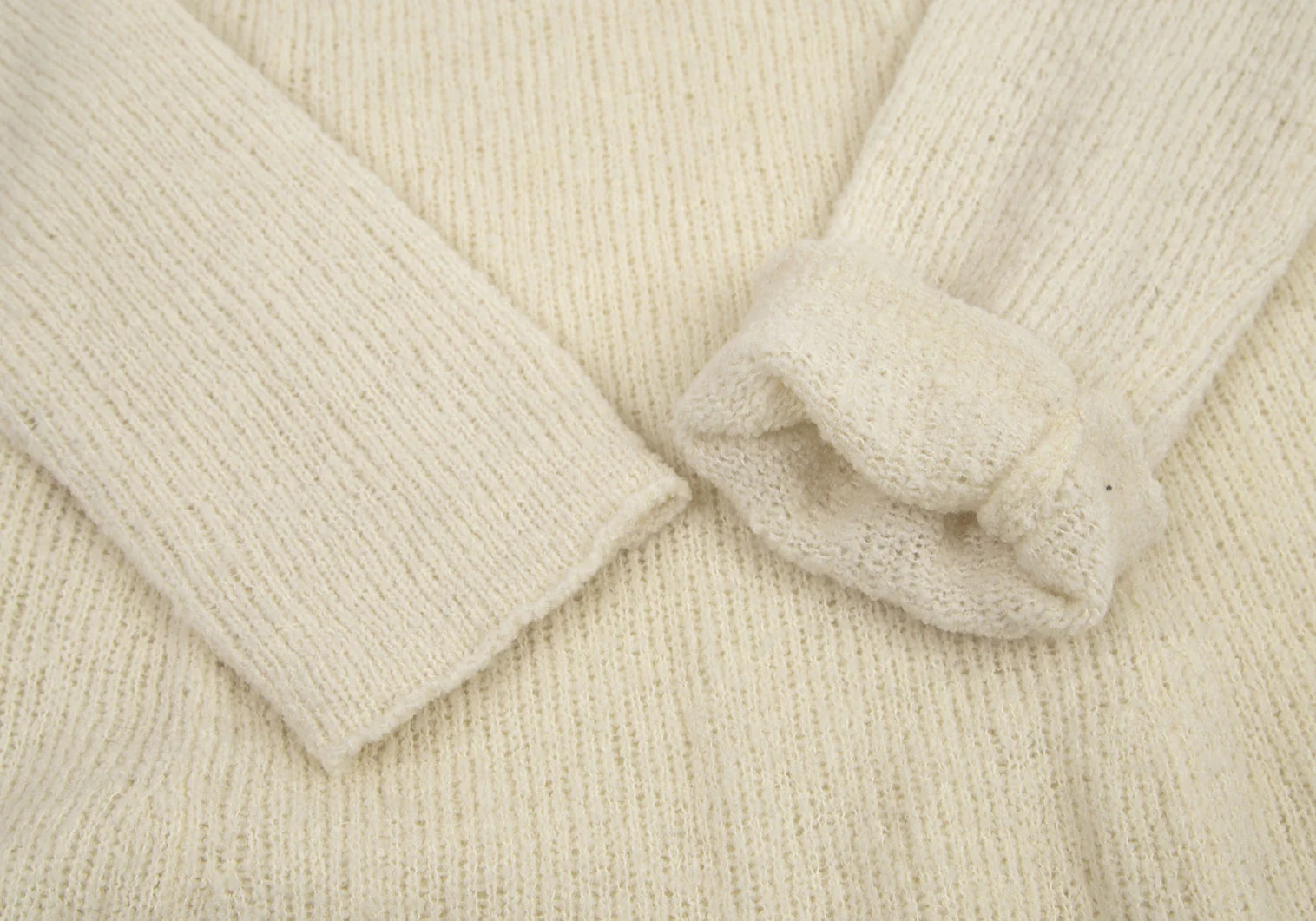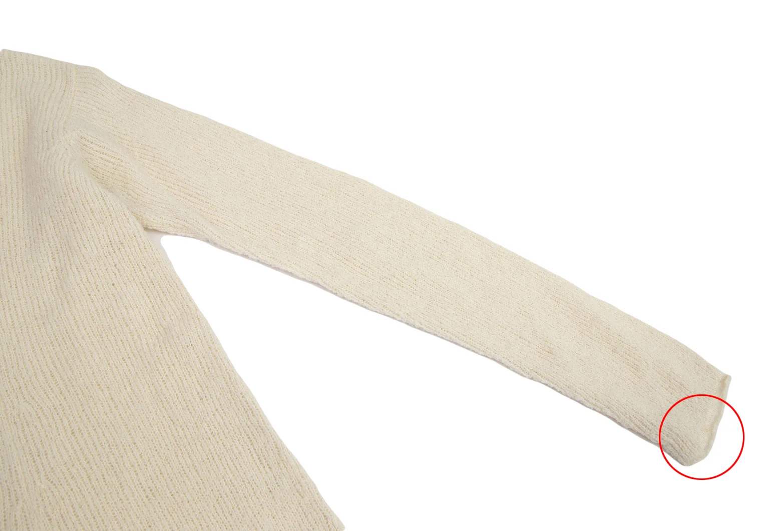 透け感があります。左袖先に薄シミ、前裾メッシュ部分に編み目広がり箇所があります(写真参照)。その他に目立ったシミ、汚れ、ほつれ等なくいい状態です。クリーニング済み